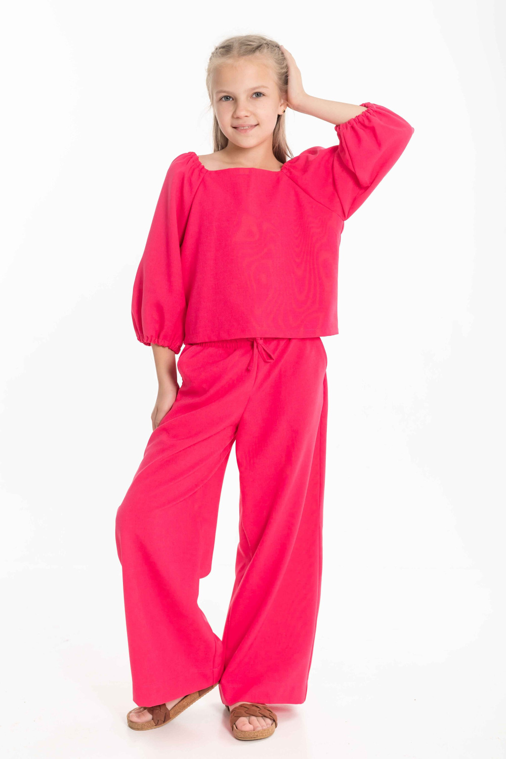 Костюм выполнен из искусственного льна. Стильный комплект состоит из блузки с регулируемыми по длине рукавами на резинке и брюк-палаццо на высокой посадке. Брюки дополнены боковыми карманами и эластичным поясом со шнуром для удобной посадки. Идеальный ансамбль для создания модного и комфортного образа.