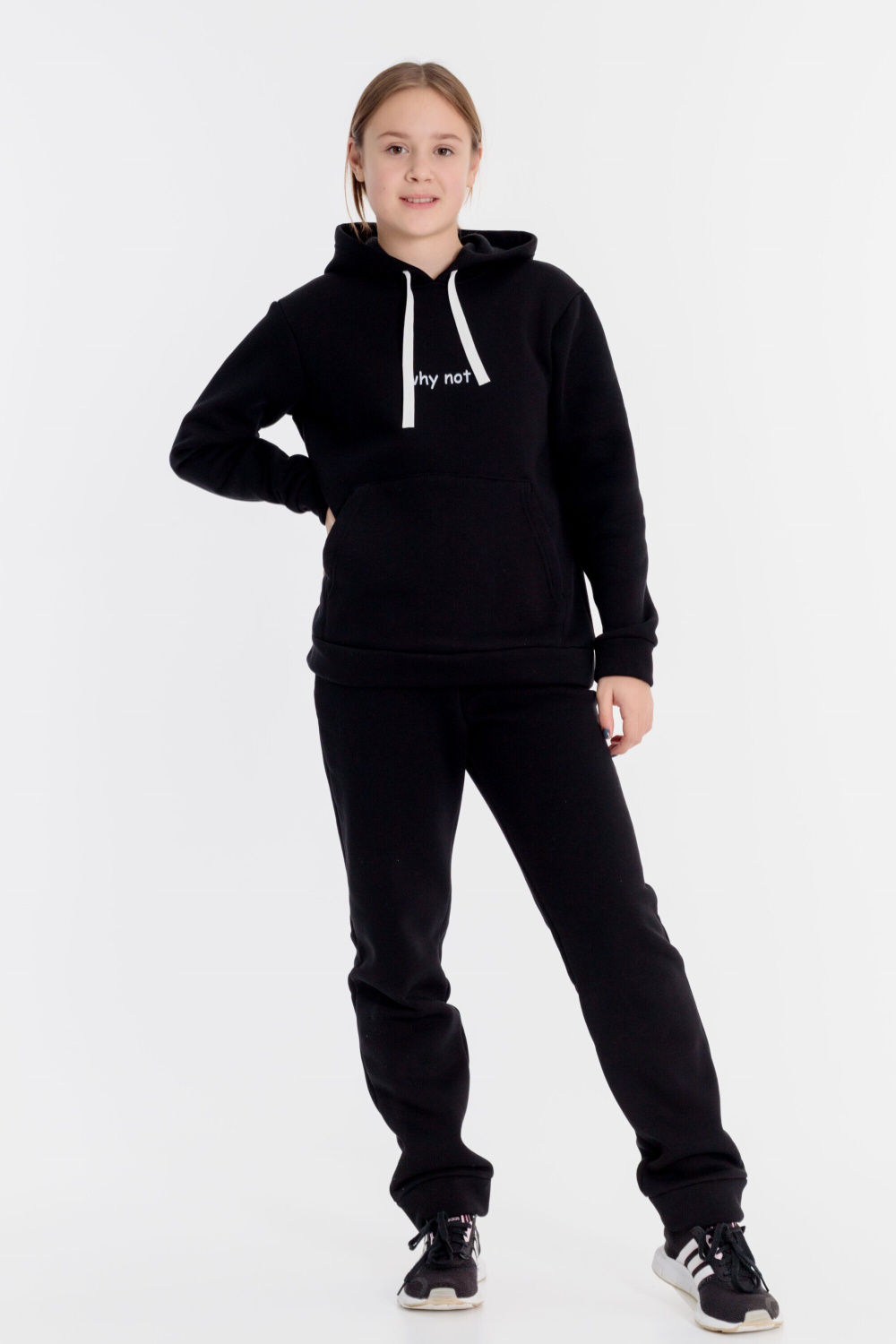 Костюм выполнен из футера с начёсом (трёхнитка), состоит из толстовки и брюк. Толстовка с капюшоном, карманом-кенгуру и принтом спереди. Пояс толстовки, низ рукавов и низ брюк оформлены манжетами из основного полотна. Пояс брюк на резине и шнуре.
