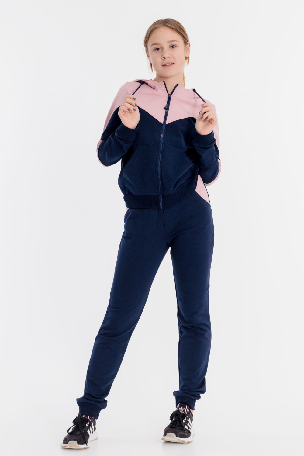 Костюм выполнен из футера с лайкрой двух цветов. Толстовка на молнии, с капюшоном, карманами-кенгуру, притачным поясом и манжетами. Брюки с поясом на резине, манжетами и карманами по бокам.