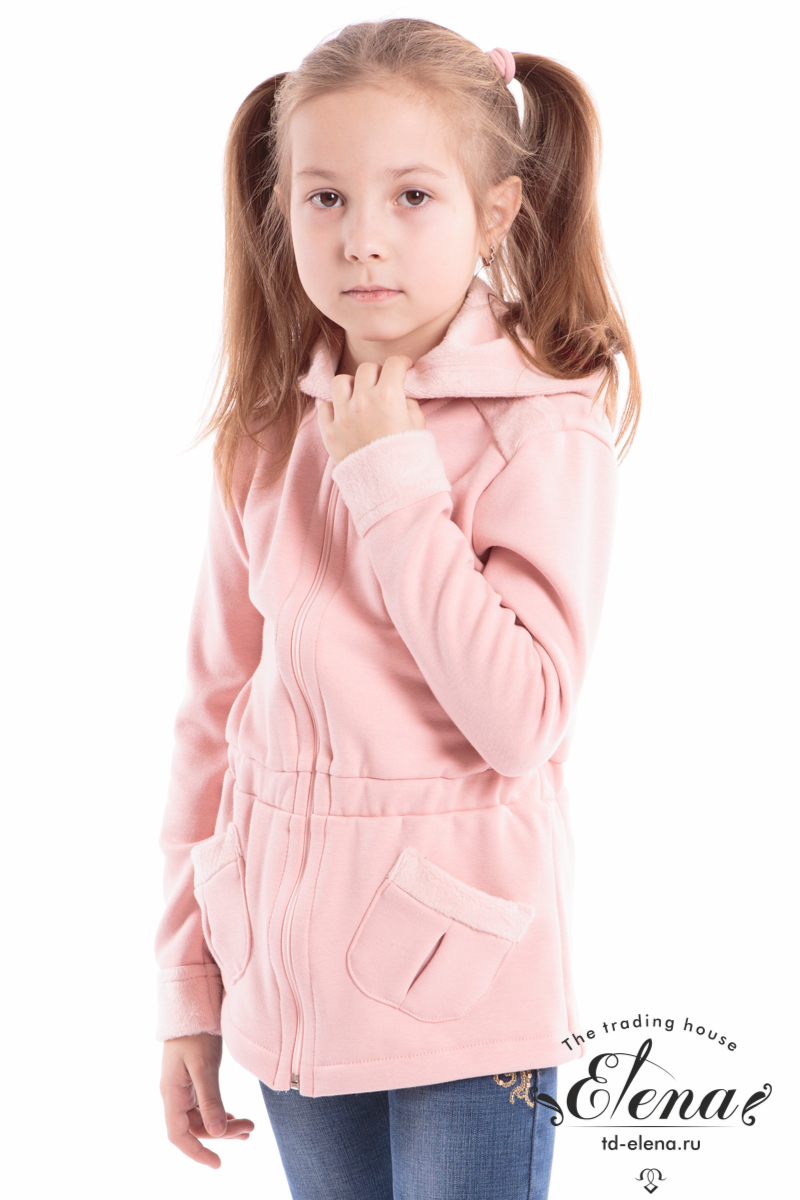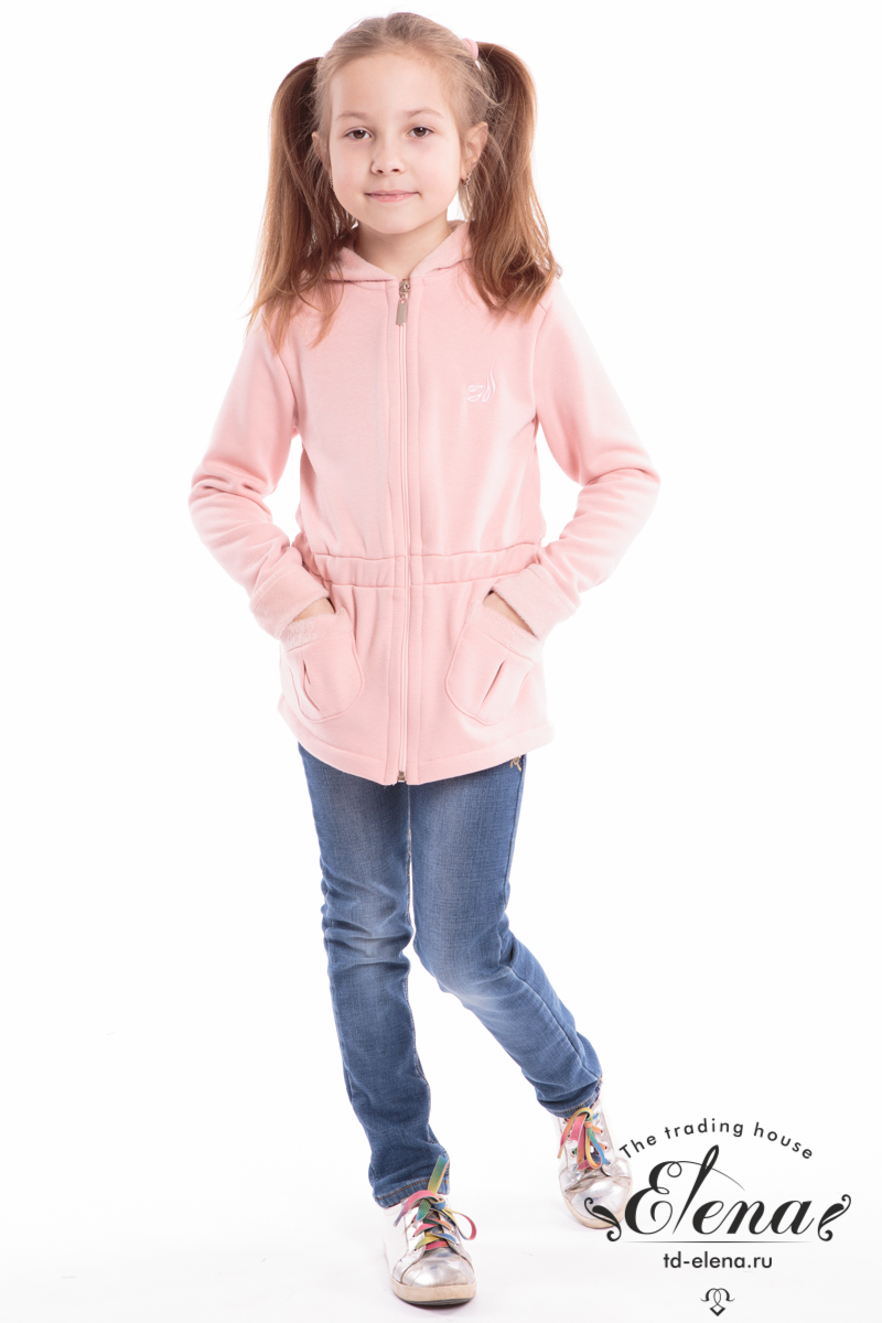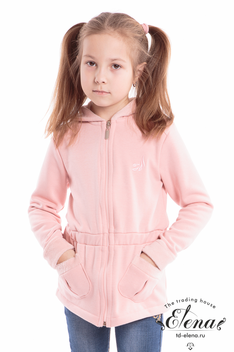 Толстовка с застёжкой на молнию выполнена из футер петли трёхнитки. По линии талии вставлена резинка, спереди два кармана. Рукав длинный, заканчивается отворотом. С левой стороны вышивка.