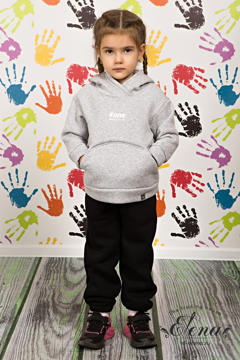 Детская толстовка выполнена из однотонного футера с начёсом (трёхнитка). С запахнутым капюшоном и накладным карманом спереди. С притачным поясом и манжетами. В качестве отделки принт спереди и две нашивки: на поясе и капюшоне.