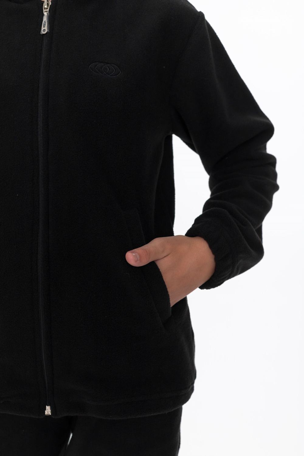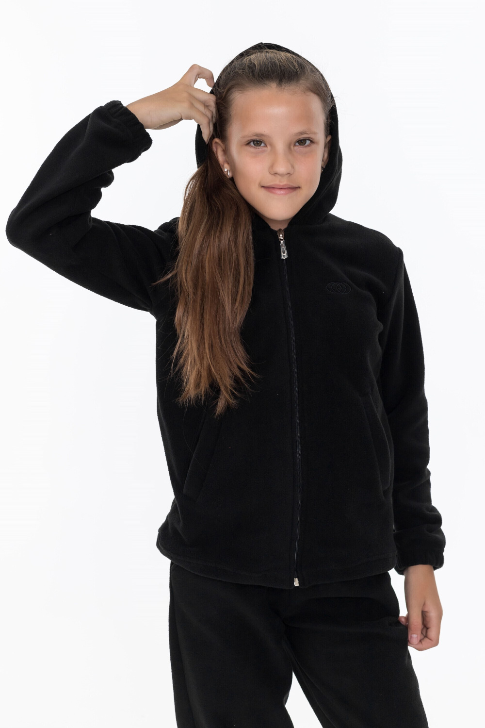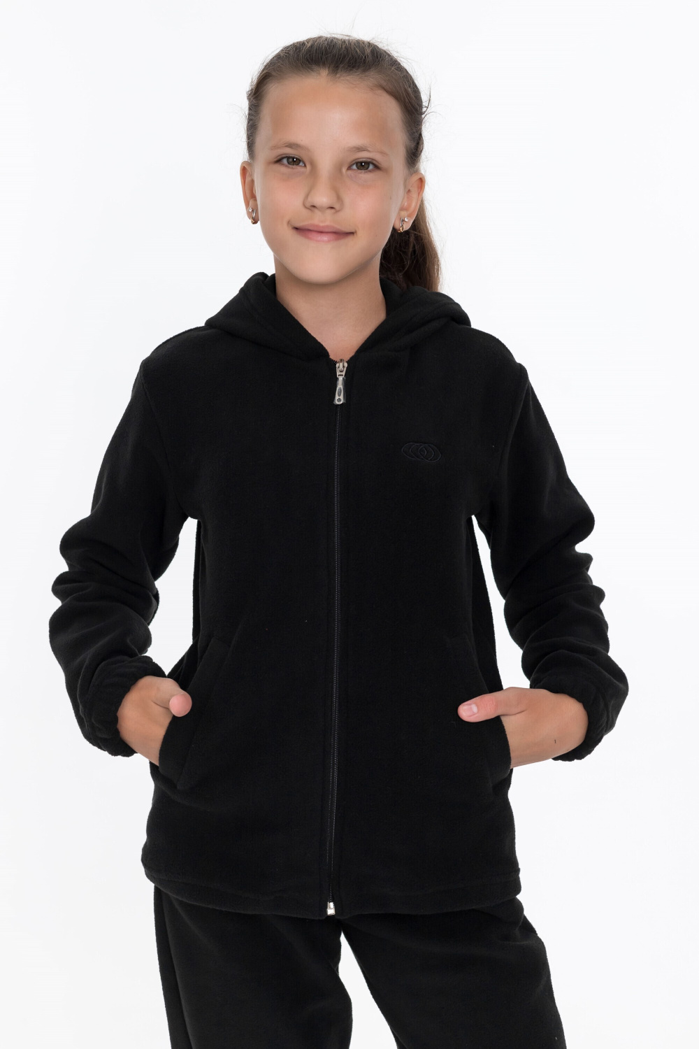 Толстовка для девочки выполнена из мягкого и тёплого флиса чёрного цвета. Модель прямого кроя обеспечивает свободу движений. Центральная застёжка на молнию, боковые карманы и наличие капюшона делают эту толстовку удобной и практичной. Длинные рукава оснащены манжетами на резинке, что предотвращает задирание рукавов во время активных игр. На левой полочке толстовки расположена вышивка, добавляющая изделию оригинальности.