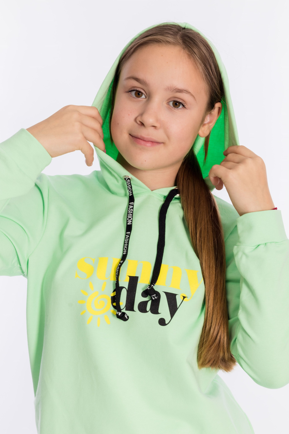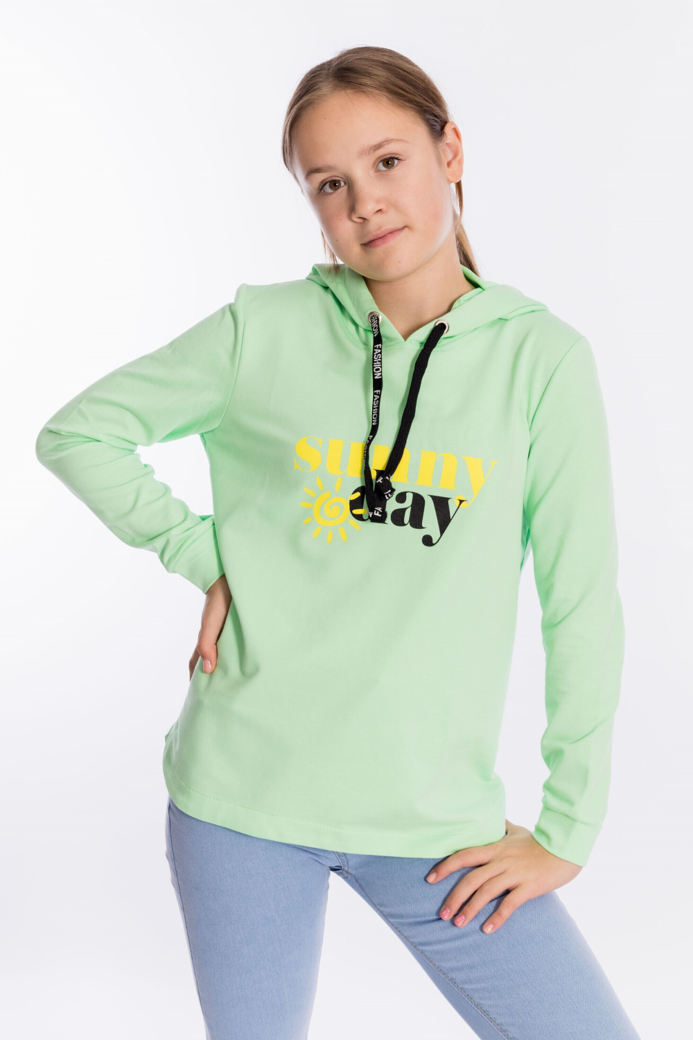 Толстовка для девочек с капюшоном из однотонного футера с лайкрой сочетает комфорт, стиль и оригинальный дизайн.