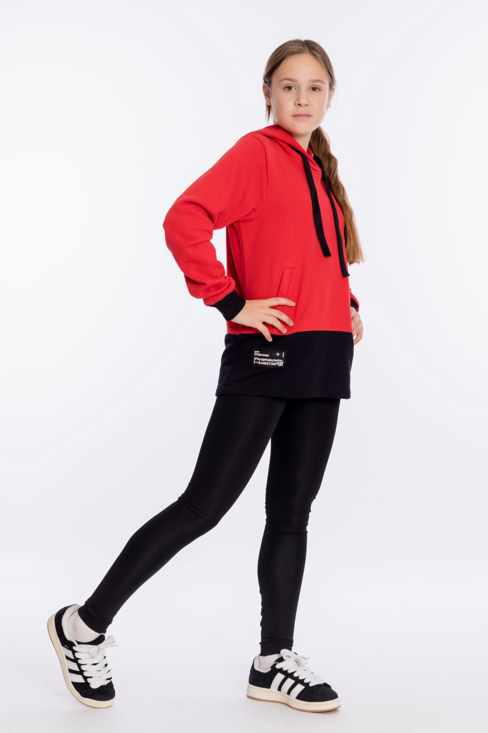 Толстовка выполнена из футера трёхнитки (воздушка). На вставке капюшона нанесён принт, через люверсы проложен шнур. По бокам расположены карманы, справа настрочена нашивка. Длинный рукав заканчивается манжетом из кашкорсе.