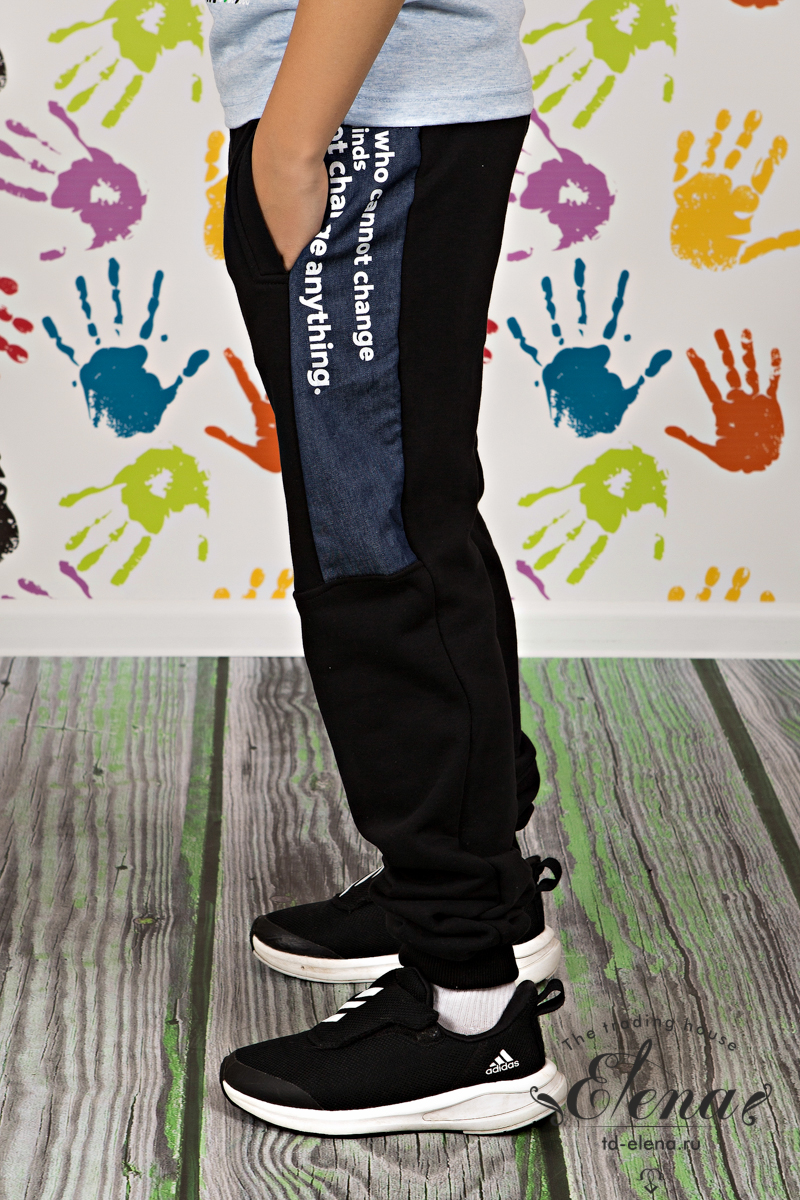 Брюки из однотонного футера-воздушки с деталями из джинсовой ткани и манжетами из кашкорсе. Пояс на резине, через термолюверсы в качестве декора вставлен шнур. Сзади посередине настрочена декоративная тесьма. По бокам размещены карманы, сзади кокетка и накладной карман.