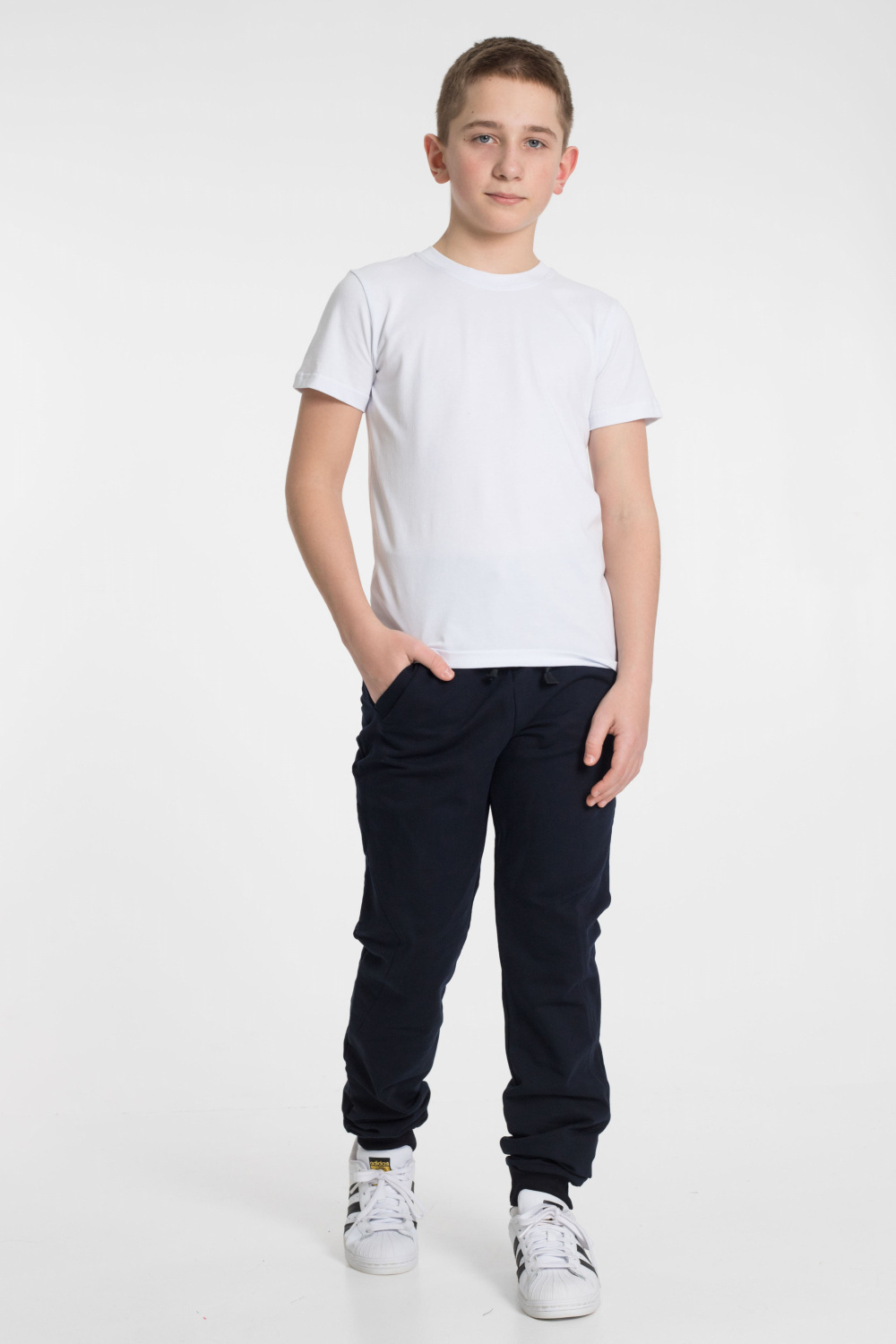Брюки выполнены из футера с добавлением лайкры. С притачным поясом и манжетами из кашкорсе. Пояс с широкой резиной, через люверсы проложен шнур. Покрой брюк с отделочными уголками, которые образуют ромб по бокам брючин. По бокам размещены наклонные, прорезные карманы, с левой стороны вышивка.