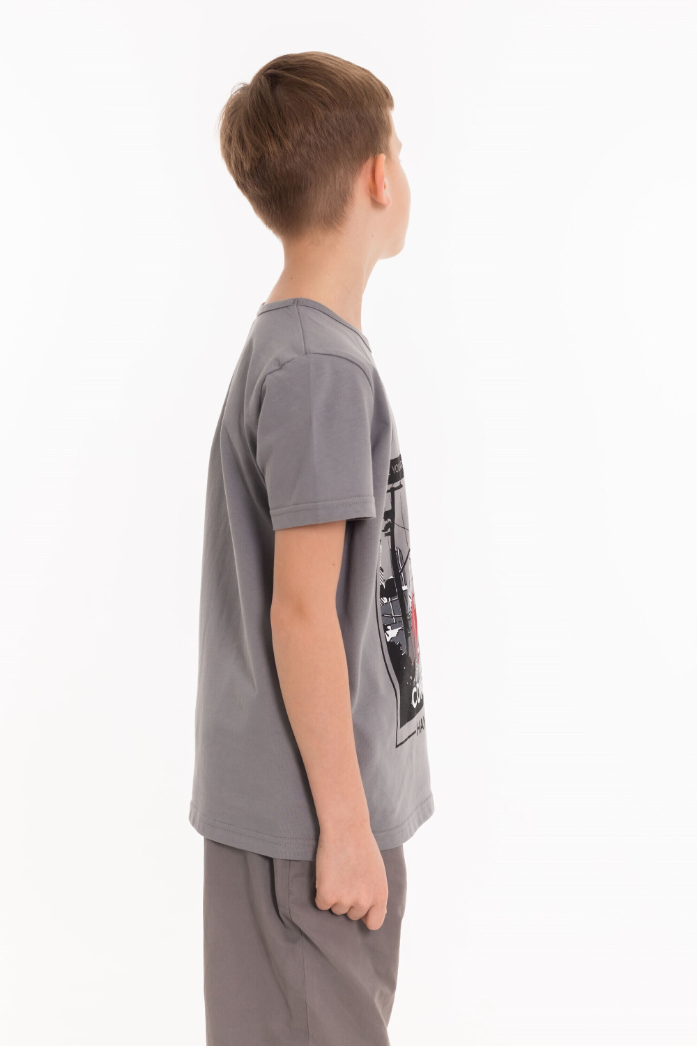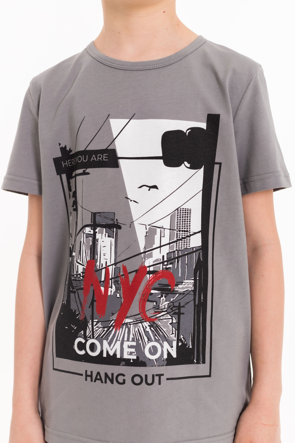 Футболка детская выполнена из кулирки. Вырез горловины круглый, спереди нанесён оригинальный принт.