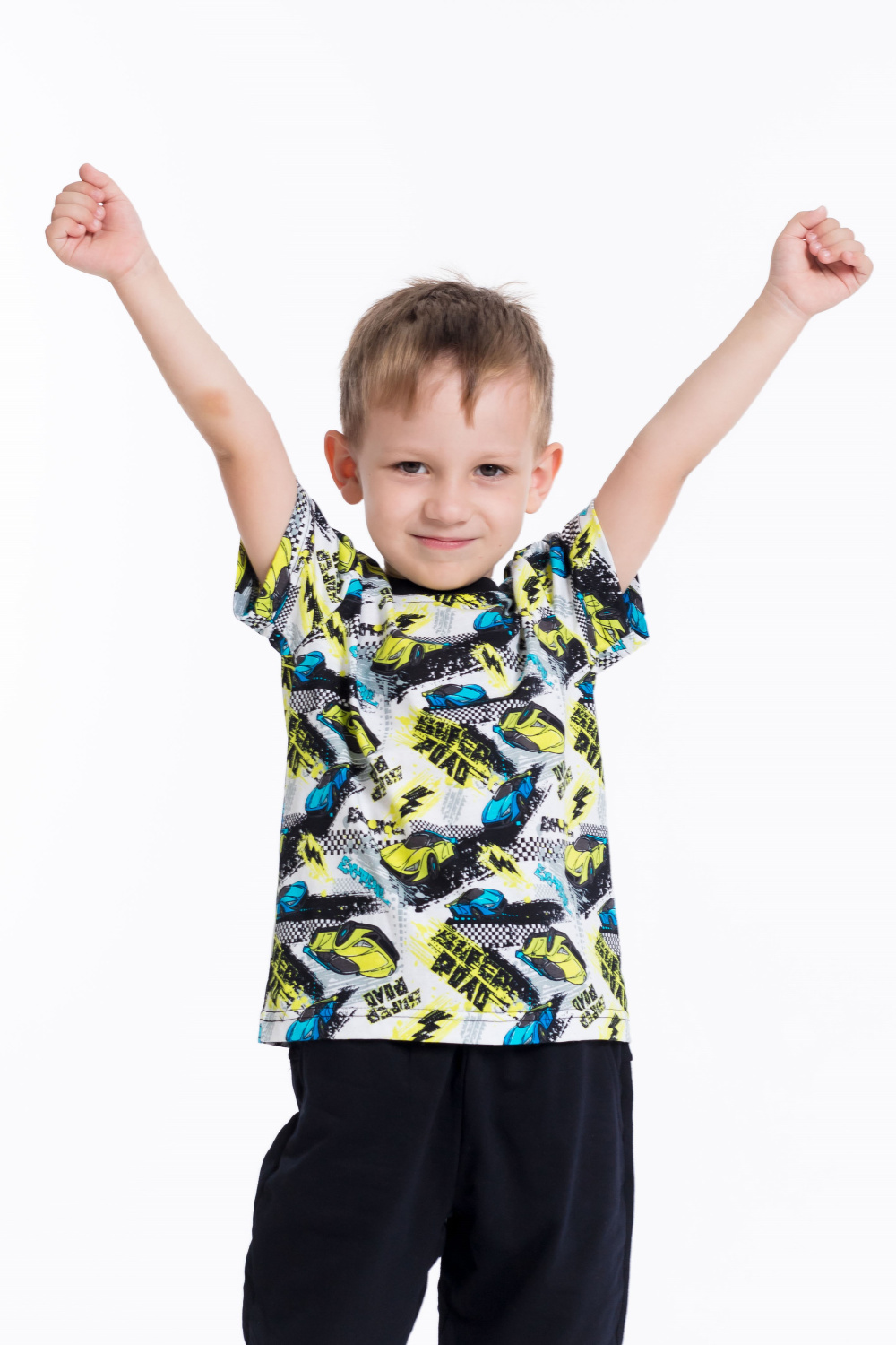Футболка выполнена из хлопкового полотна c набивным рисунком, с коротким рукавом и круглым вырезом горловины.