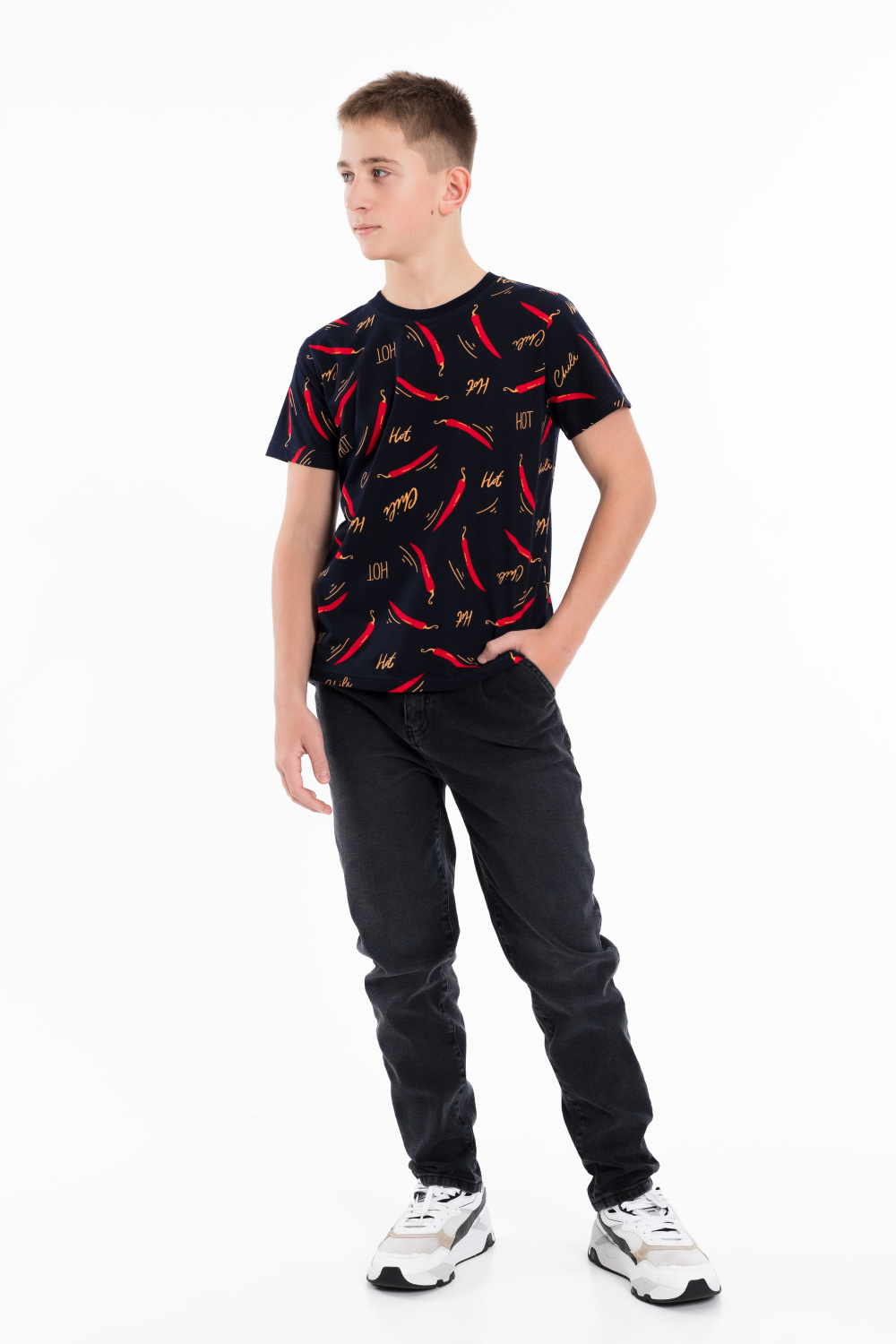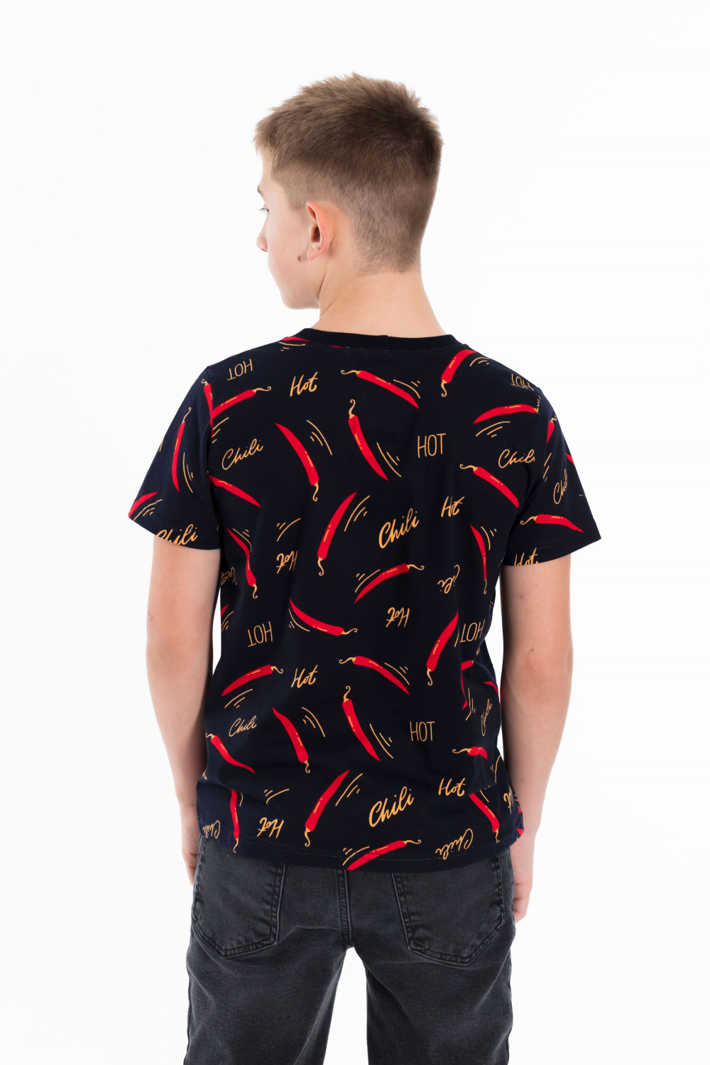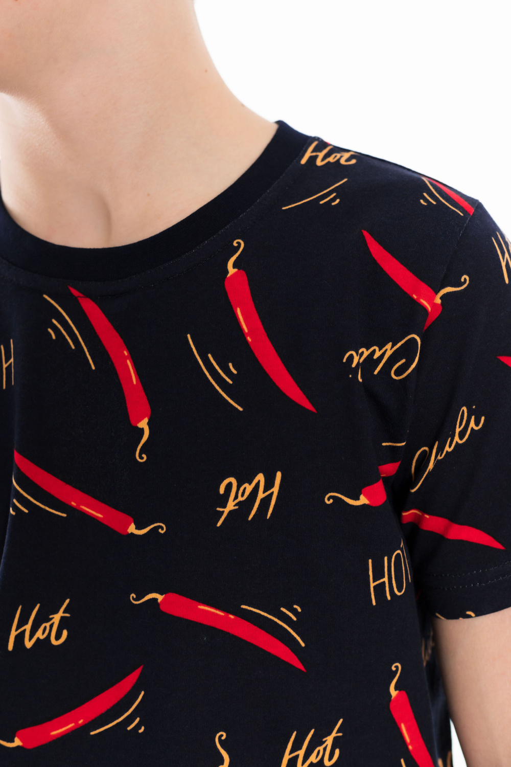 Футболка выполнена из хлопкового полотна c набивным рисунком, с коротким рукавом и круглым вырезом горловины.