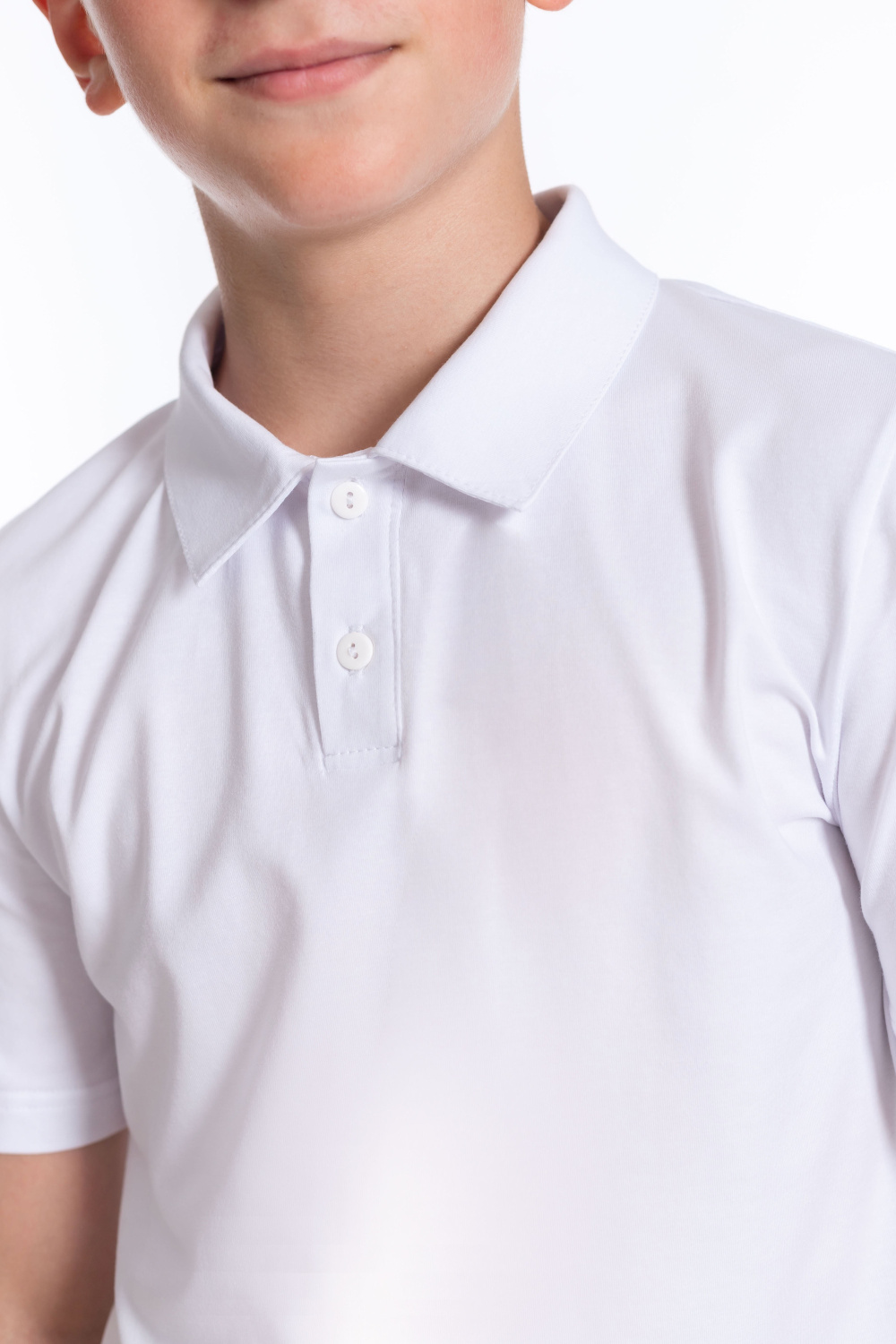 Отличный выбор для школьника — белая футболка-поло с коротким рукавом из материала кулирка с лайкрой и застёжкой на две пуговицы. Воротник придаёт изделию аккуратный вид, а качественный материал обеспечивает комфорт при носке.