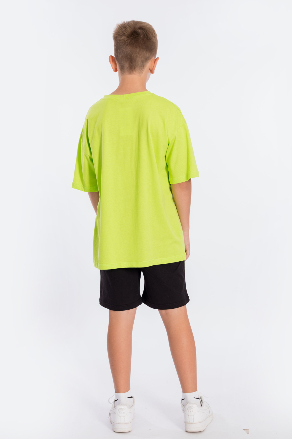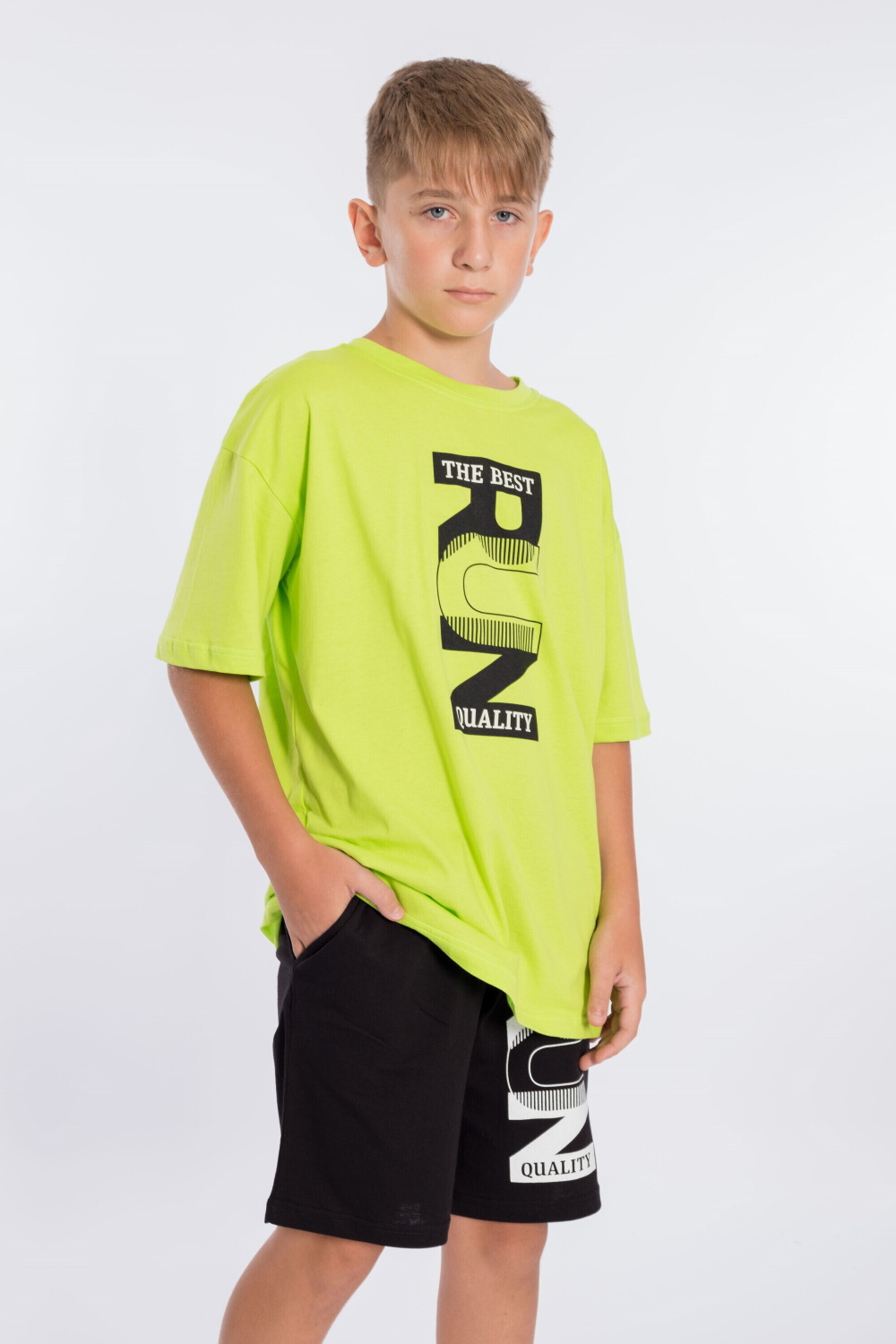 Костюм выполнен из кулирки, состоит из футболки и шорт. Футболка свободного силуэта, со спущенной линией плеча. Спереди нанесён принт. Шорты слегка расширены, с поясом на резине, принтом и карманами по бокам.