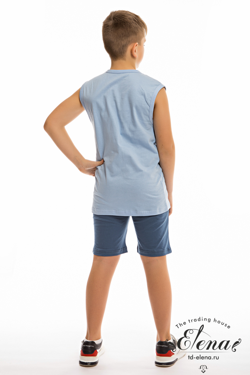 Костюм для мальчика выполнен из кулирки, состоит из шорт и майки. Майка однотонная, с принтом спереди, проймы и горловина обработаны бейкой. Шорты с поясом на резинке и принтом.