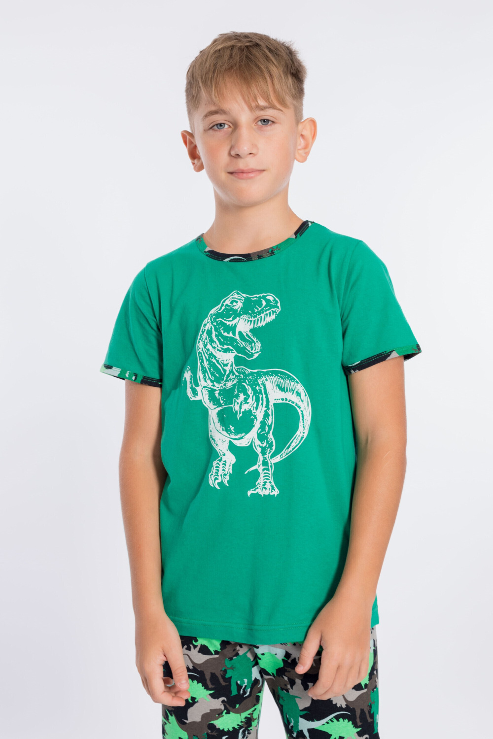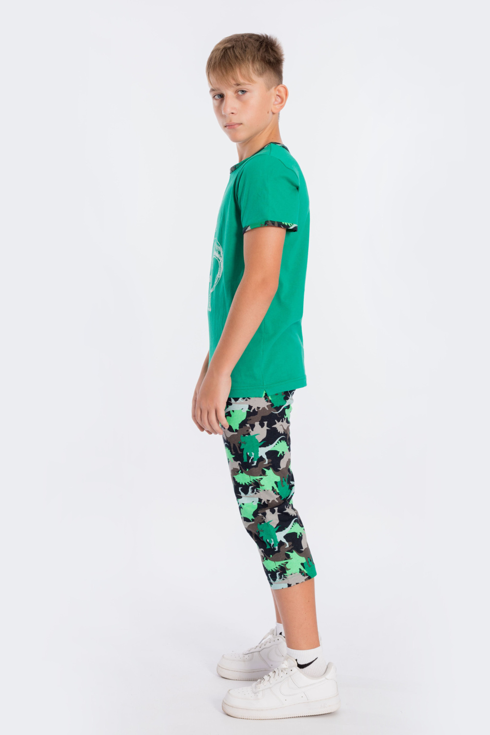 Костюм для мальчика выполнен из хлопка комбинированных расцветок, состоит из футболки и капри. Футболка с коротким рукавом и принтом спереди, низ рукавов и круглая горловина обработаны бейкой. Капри без боковых швов, на резине по поясу.