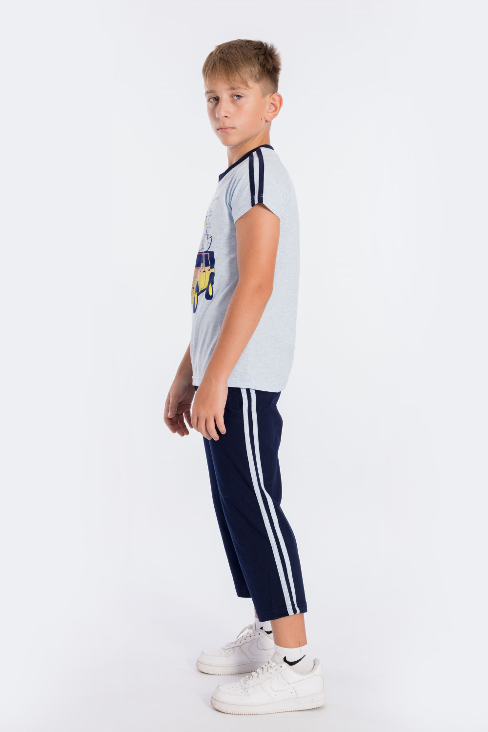 Костюм для мальчика выполнен из кулирки, 100% хлопок. Футболка с принтом спереди. Вырез горловины круглый, рукава покроя реглан с лампасами. Капри с карманами по бокам и лампасами, пояс на резинке.