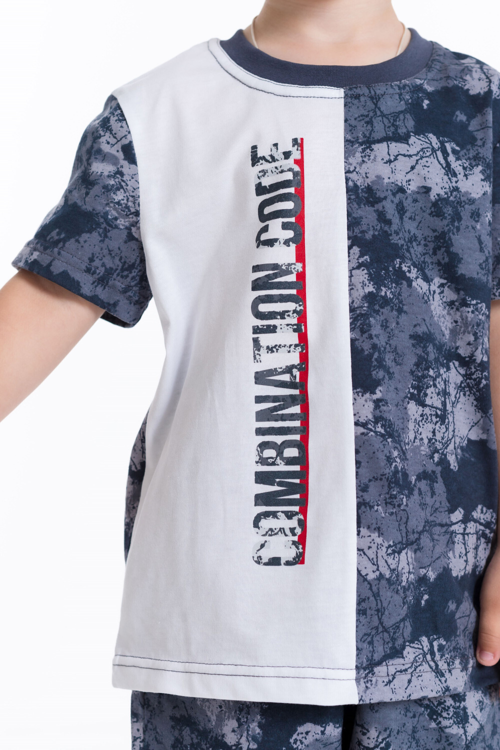 Костюм для мальчика выполнен из хлопкового полотна, состоит из футболки и шорт. Футболка с коротким рукавом и круглым вырезом горловины. Шорты средней длины, свободного кроя с поясом на резинке и шнуре. На правой полочке футболки принт.