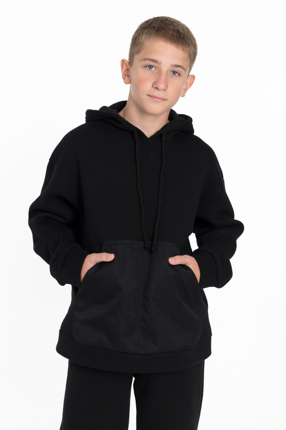 Костюм для мальчика состоит из толстовки и брюк, выполненных из высококачественного футера с начесом. Толстовка имеет спущенную линию плеча, длинные рукава и капюшон на шнуре для дополнительного комфорта. Карманы накладные спереди из саржи хлопкополиэфирной придают костюму стильный вид.