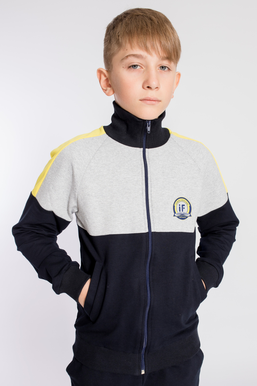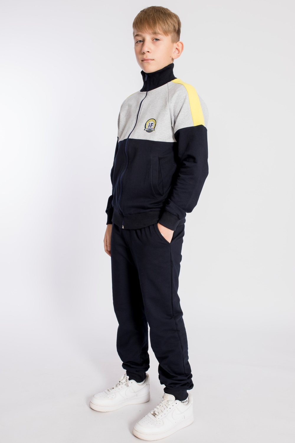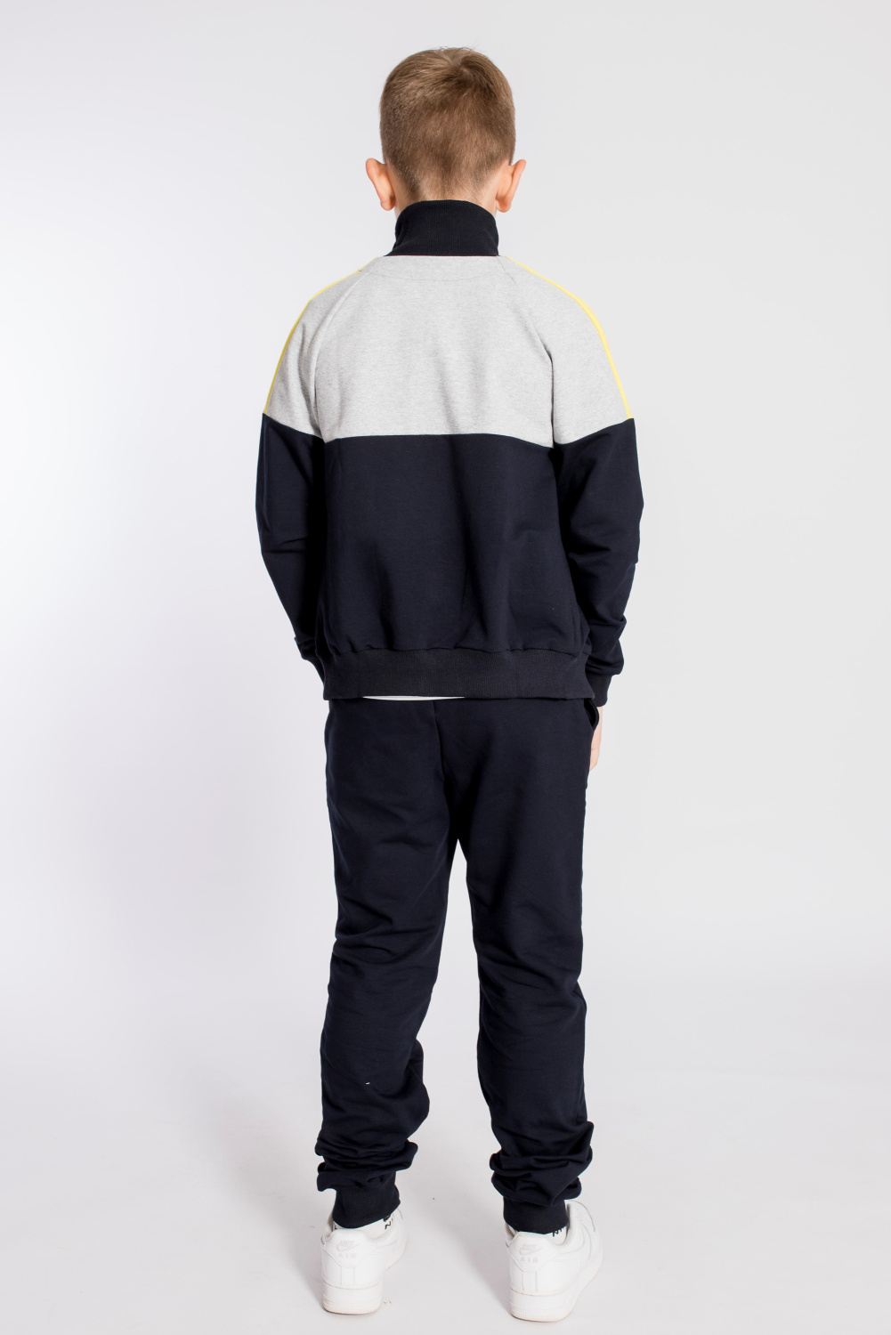 Спортивный костюм выполнен из футер петли с лайкрой. Толстовка на молнии, с рукавами покроя реглан, воротником-стойкой, манжетами и притачным поясом из кашкорсе. На толстовке и брюках есть боковые карманы и нанесён принт. Брюки с притачным поясом и манжетами, в петли пояса продернут шнур.