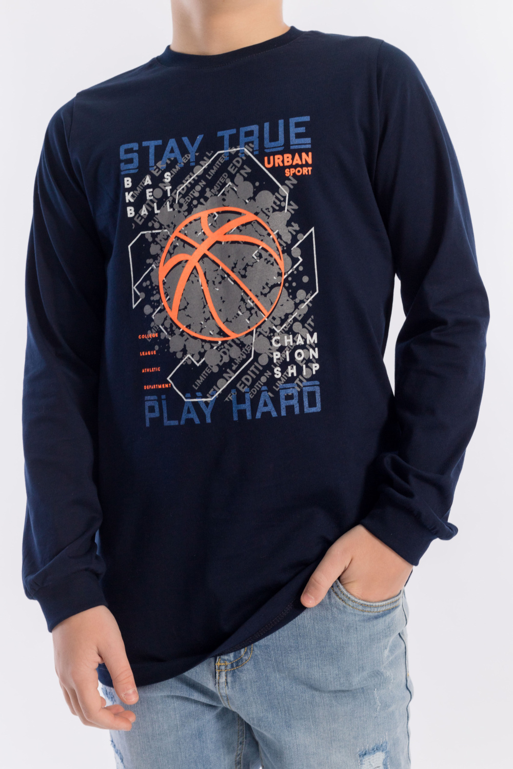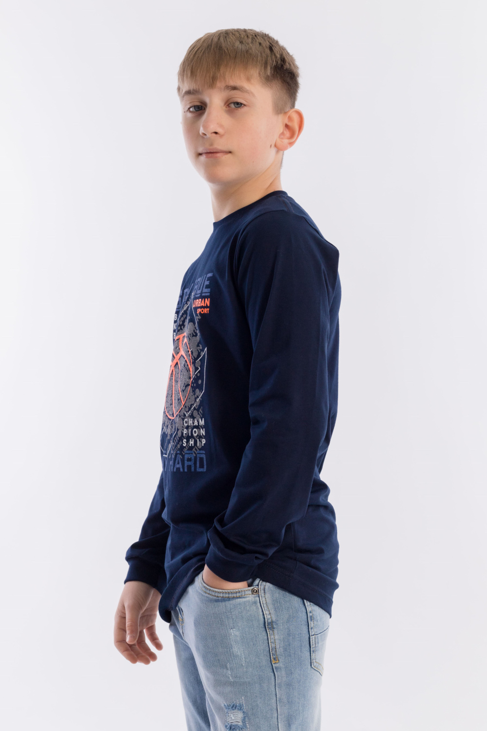 Футболка с длинным рукавом выполнена из однотонной кулирки. С притачной планкой по горловине и манжетами из рибаны. Спереди нанесён принт.