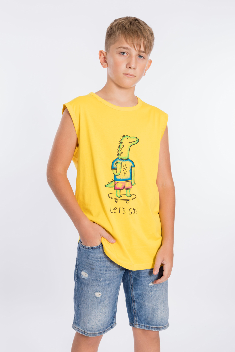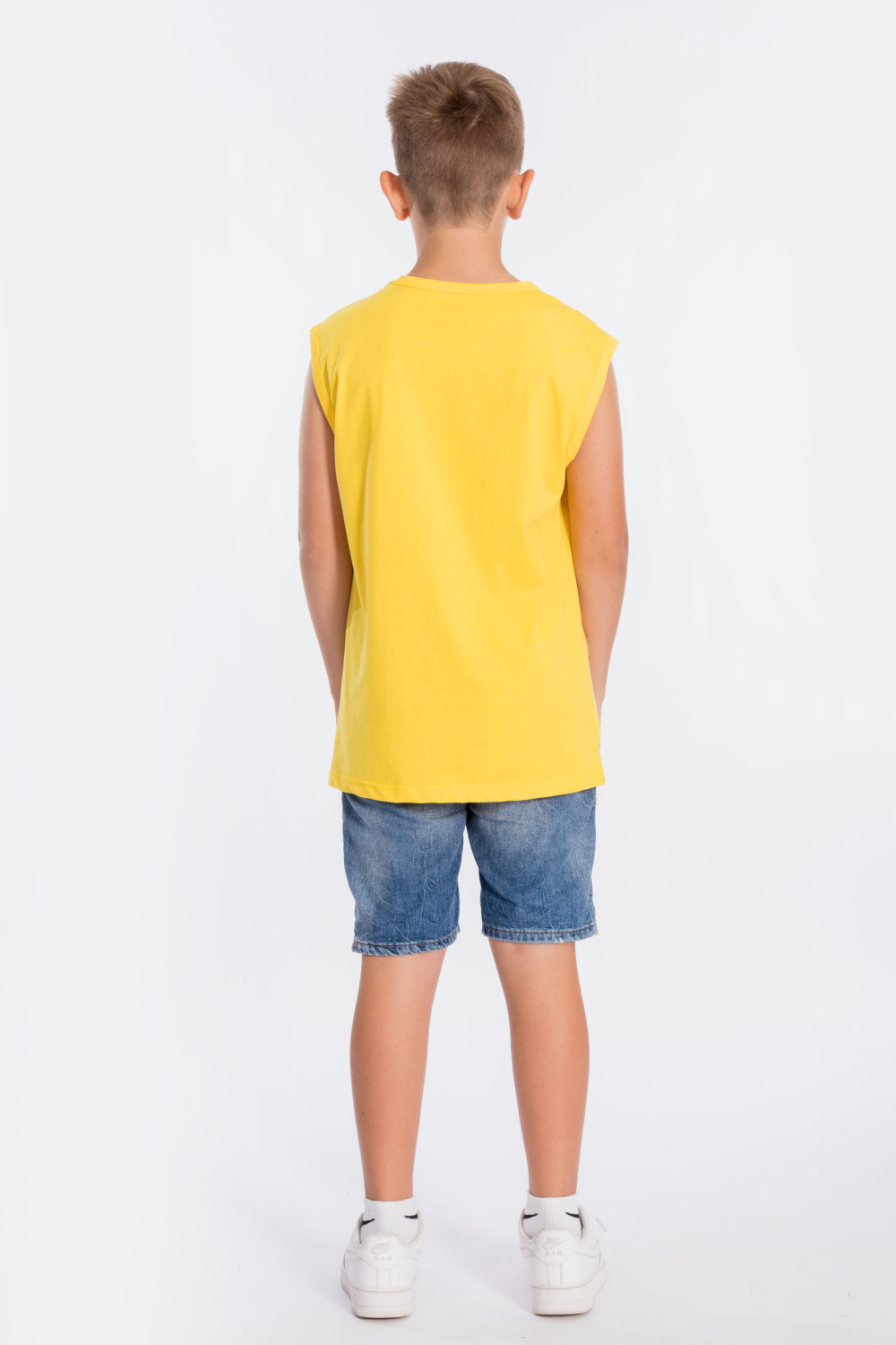 Майка из однотонной кулирки с принтом спереди.