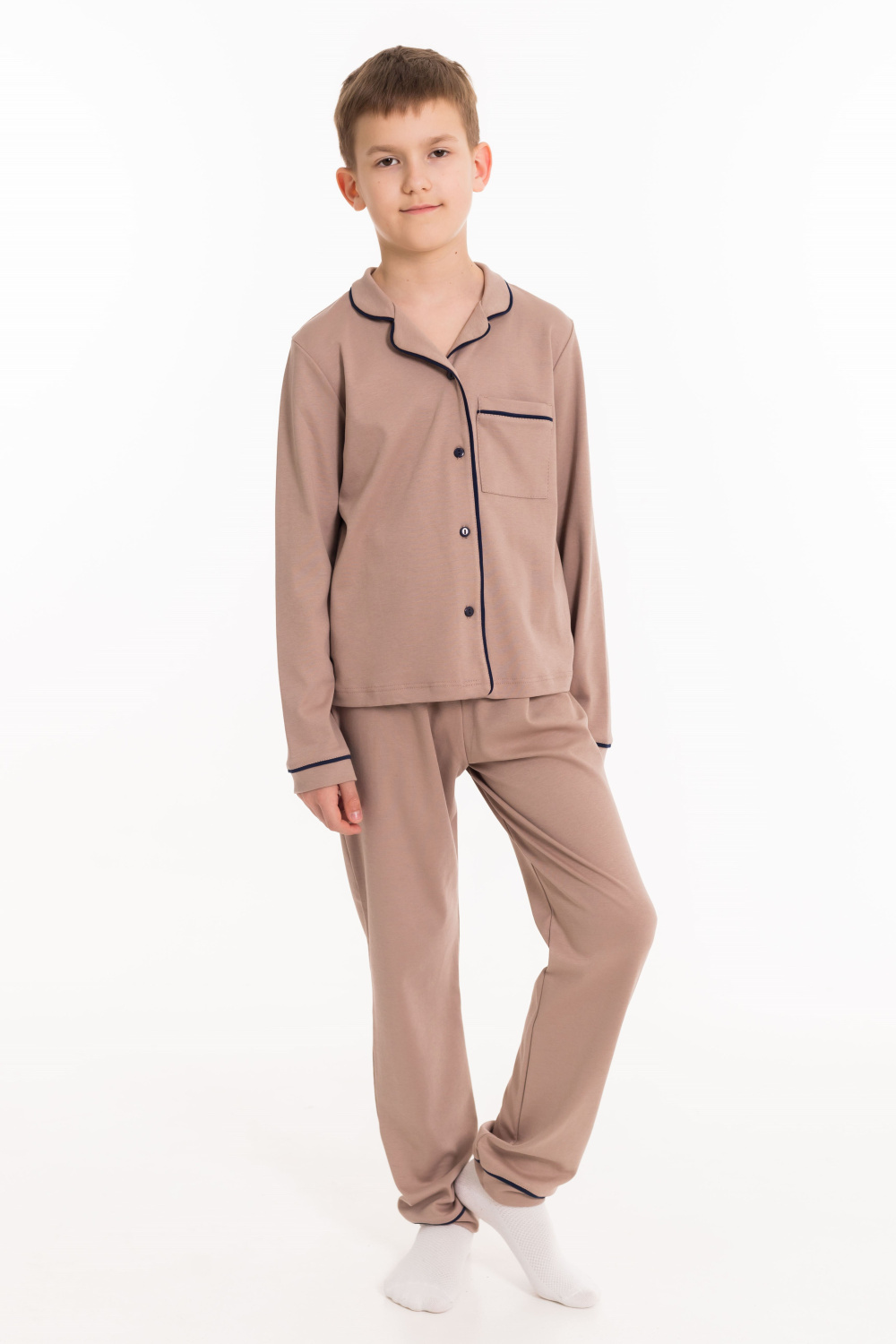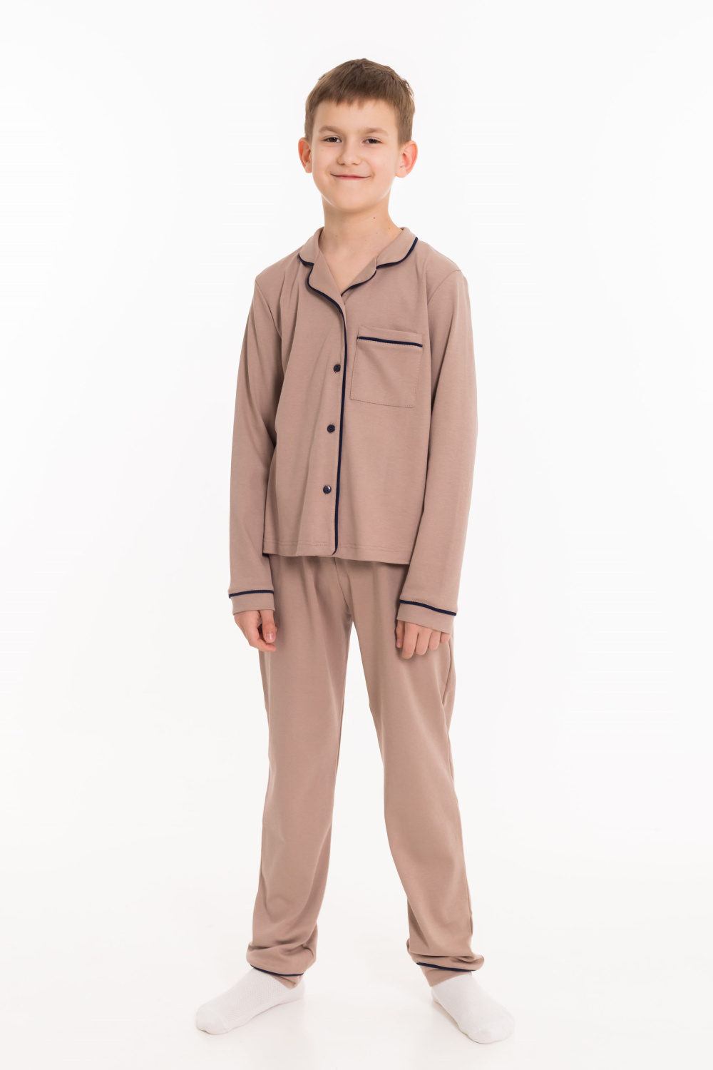 Детская пижама выполнена из интерлока, 100% хлопок. Рубашка с отложным воротником, длинным рукавом и карманом спереди. Рубашка застёгивается на пуговицы. Брюки свободные, с притачным поясом на резине. Рубашка и брюки украшены декоративным элементом - кантом.
