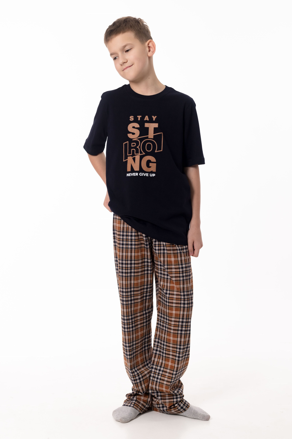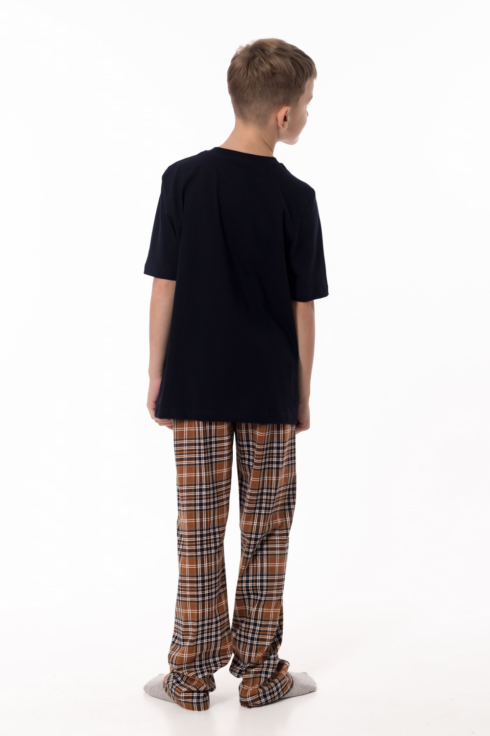 Пижама выполнена из натурального хлопкового полотна, обеспечивающего комфорт и приятные ощущения во время сна и отдыха. Комплект состоит из удобных брюк в клетку с эластичным поясом и однотонной футболки с коротким рукавом. Круглый вырез горловины аккуратно оформлен бейкой, а спереди расположен принт, придающий модели аккуратный и уютный акцент. Пижама отлично подойдёт для комфортного домашнего отдыха и спокойного сна.