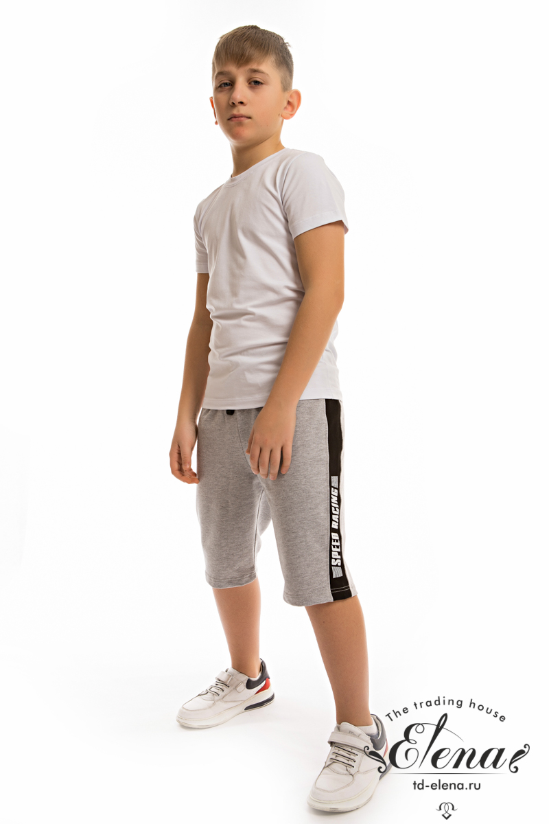 Шорты из футера с лайкрой. Пояс притачной, через петли продёрнут широкий шнур. По бокам отделочные вставки с принтом.