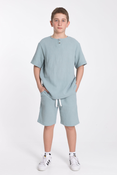 Шорты выполнены из однотонного муслина. По бокам размещены карманы, пояс с петлями и отделочным шнуром.