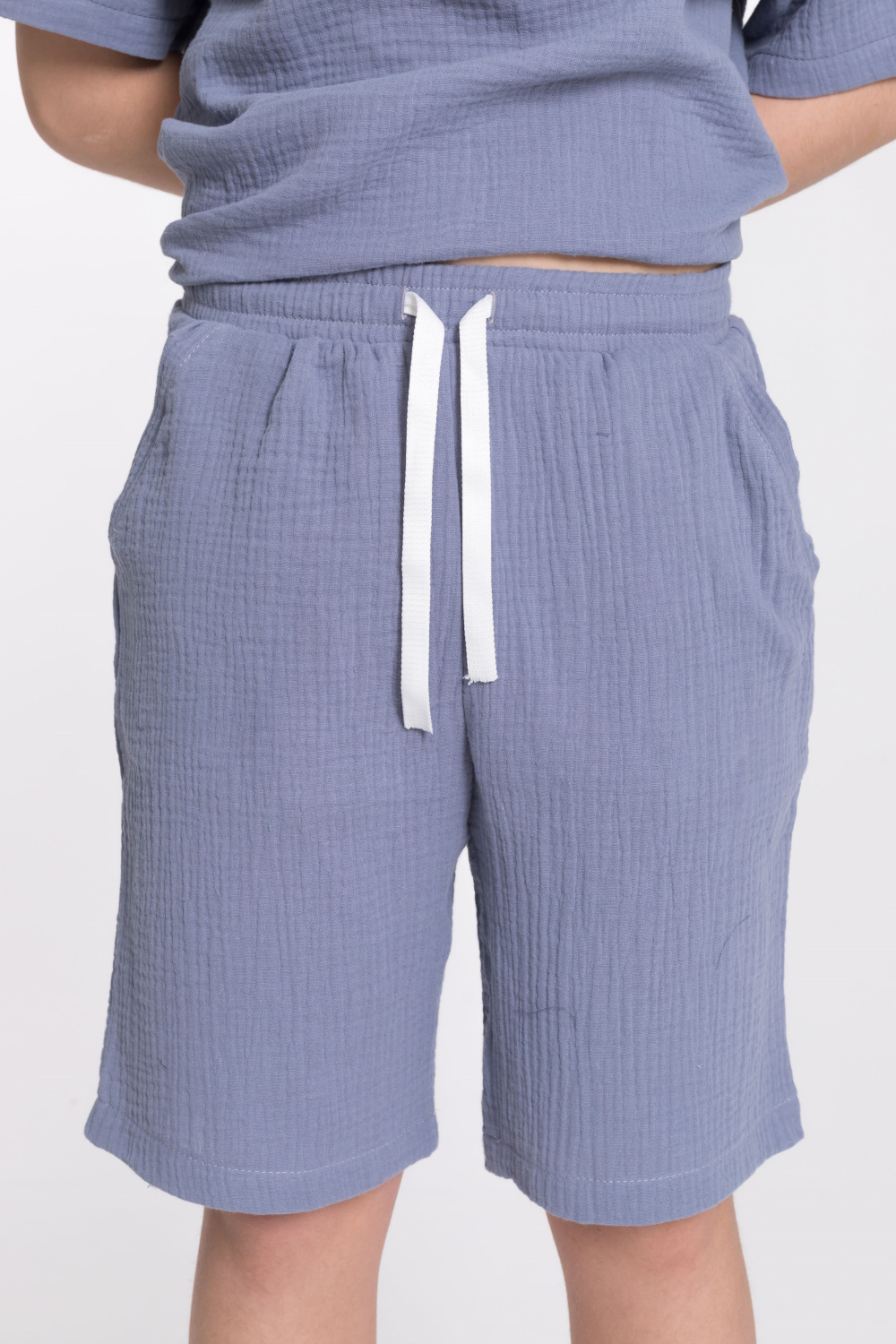 Шорты выполнены из однотонного муслина. По бокам размещены карманы, пояс с петлями и отделочным шнуром.