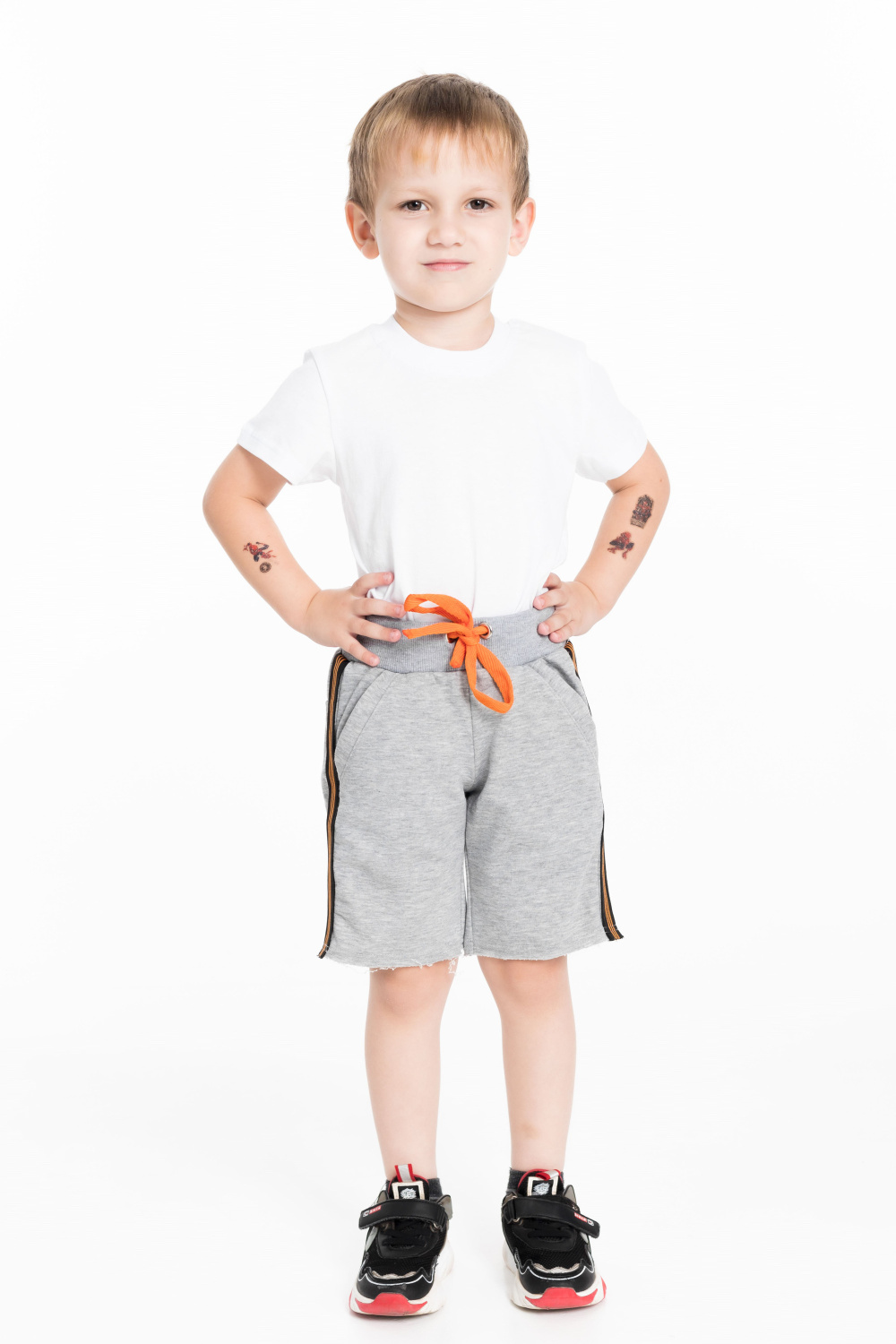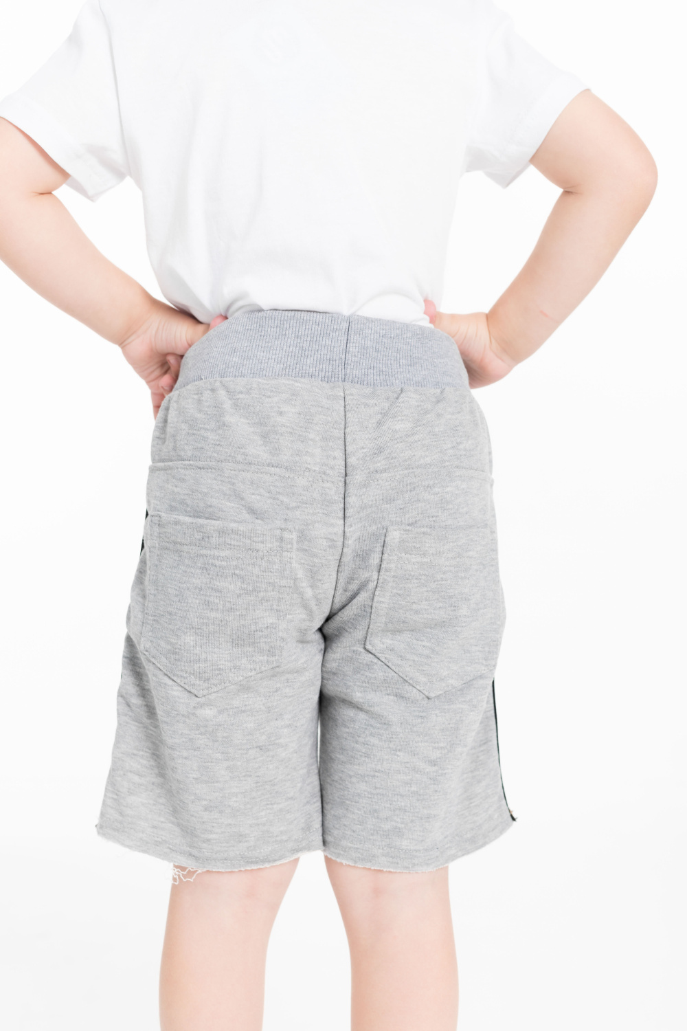 Шорты для мальчика из футер петли. В шортах есть карманы по бокам, а также сзади расположены два накладных кармана. Пояс из кашкорсе с люверсами и ярким отделочным шнуром. Вдоль бокового шва настрочены яркие полосы из декоративной резины. Низ шорт не обработан.