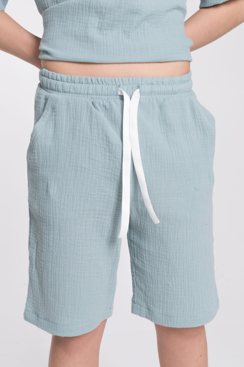 Шорты выполнены из однотонного муслина. По бокам размещены карманы, пояс с петлями и отделочным шнуром.
