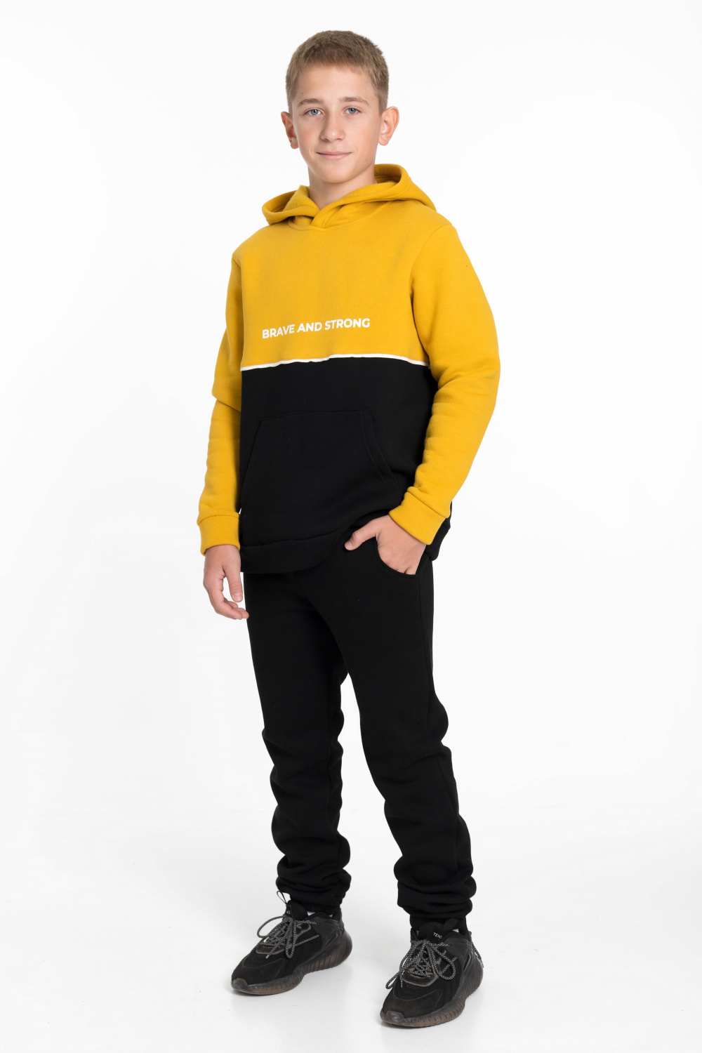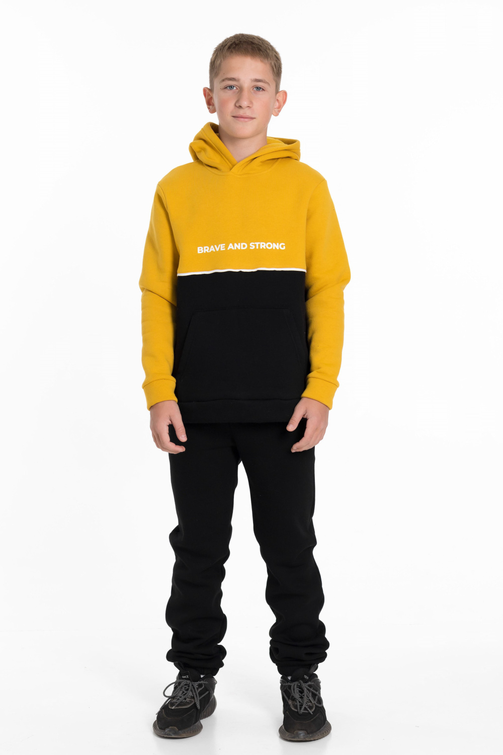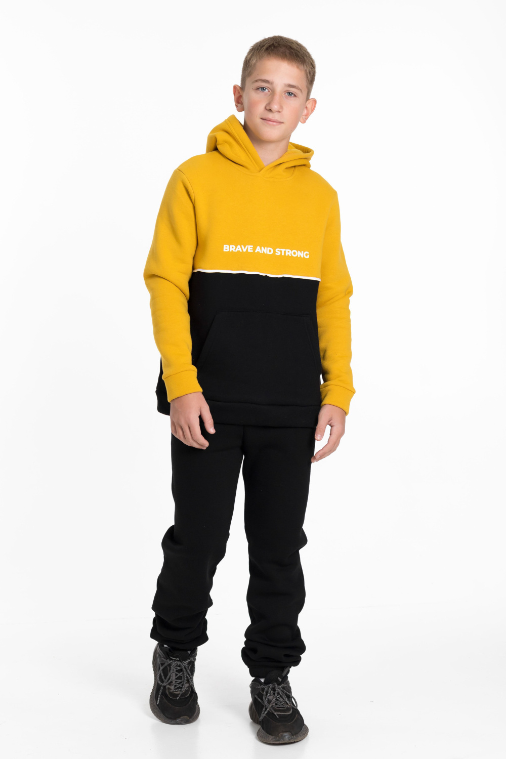 Толстовка для мальчика из футера 3-х нитки с начесом в двухцветном исполнении: горчичный и чёрный. Толстовка прямого кроя с длинным рукавом идеально подойдет для повседневной носки, добавит яркости и стиля в гардероб мальчика. Принт на верхней части полочки придаст дополнительный акцент и интересный вид. Капюшон поможет защитить голову от ветра и холода, а карман-кенгуру станет удобным местом для различных мелочей.