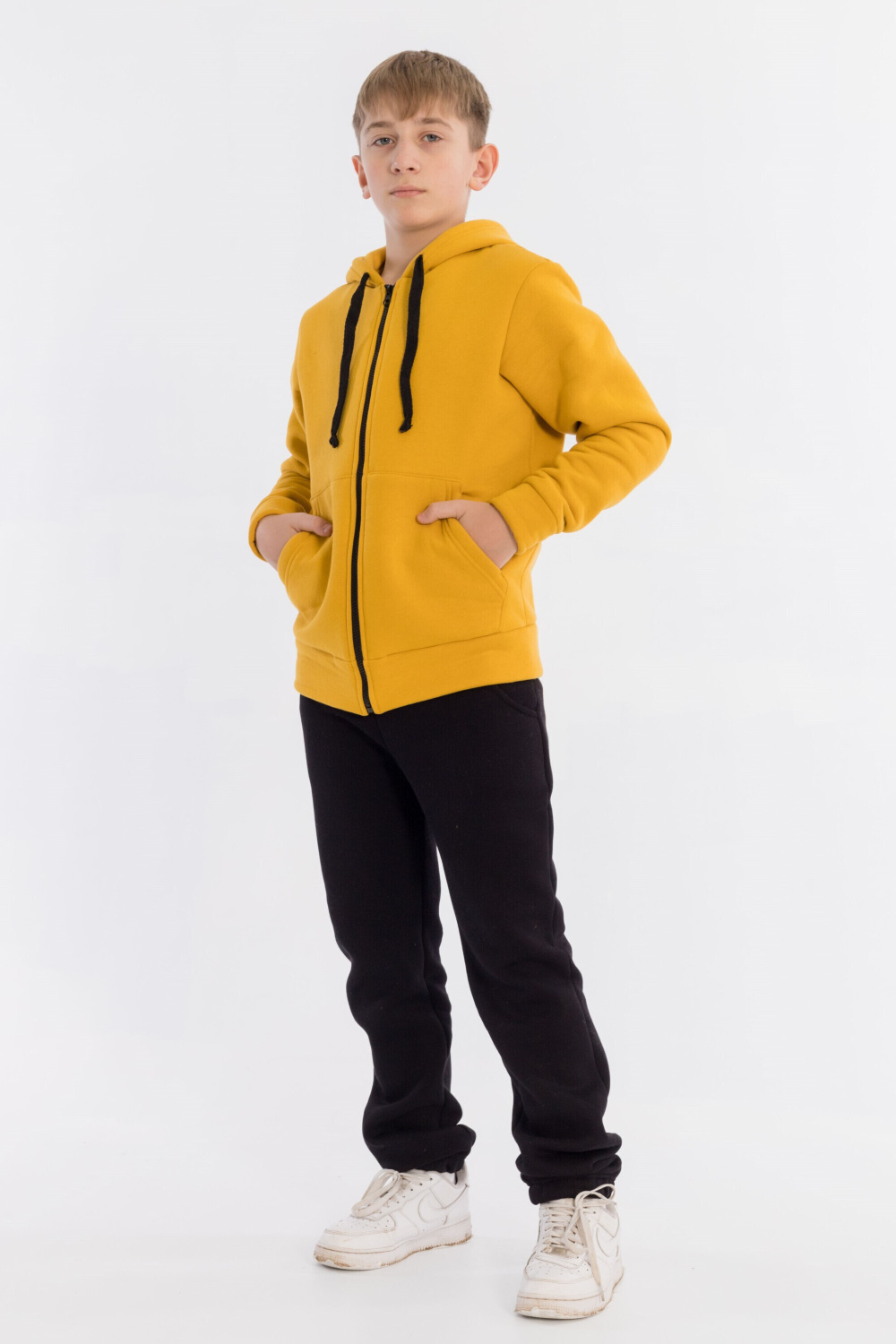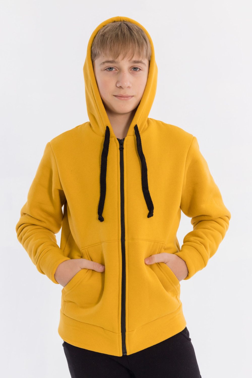 Толстовка выполнена из однотонного футера трёхнитки (начёс). Спереди с застёжкой на молнию и карманами. Ширина капюшона регулируется при помощи шнура, манжеты рукавов и пояс толстовки из основного полотна.