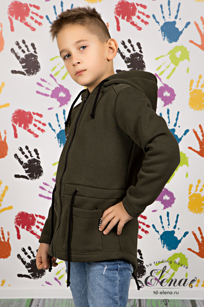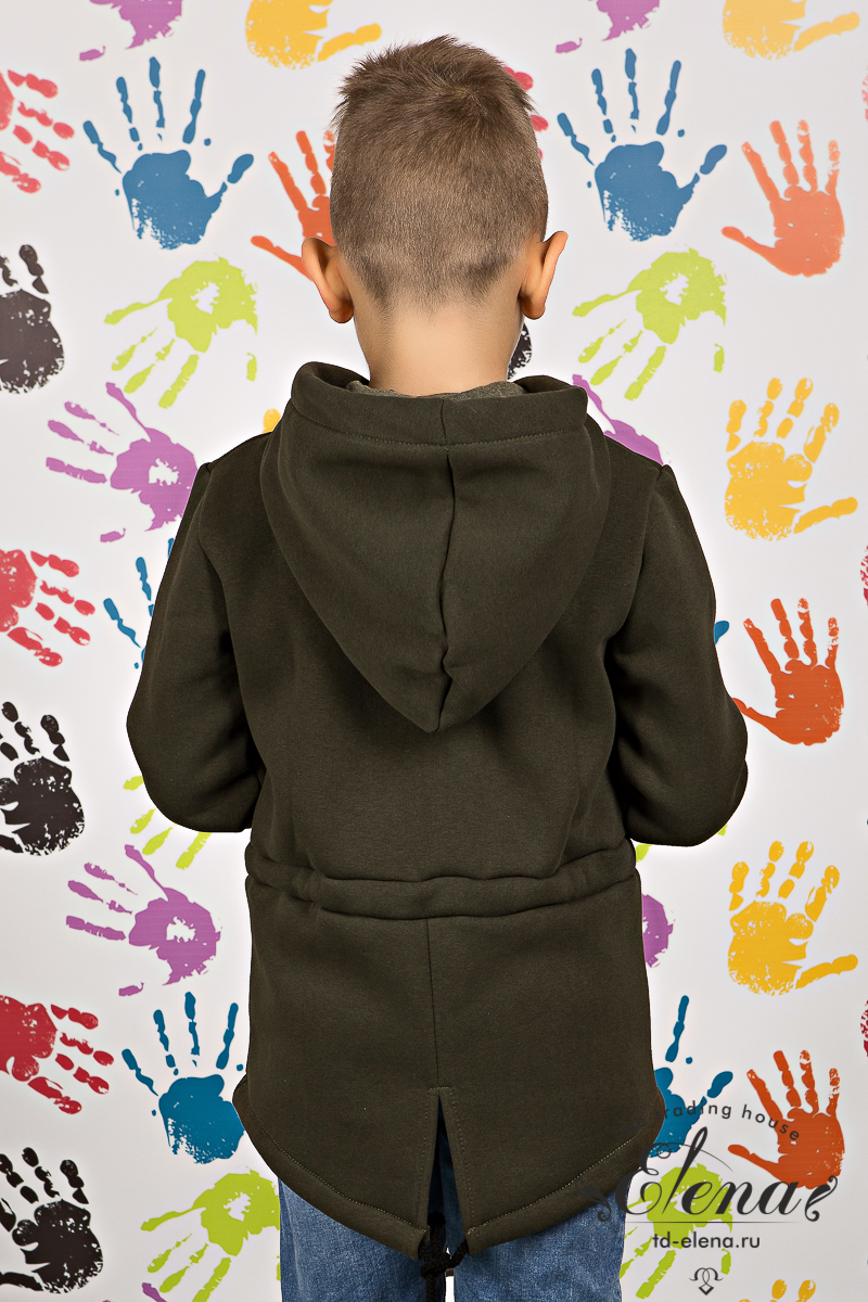 Толстовка с капюшоном, выполнена из полотна с начёсом. По линии талии проложена кулиска, которая регулирует прилегание к телу. Спереди настрочены карманы. Украшает толстовку лейба и маленький флажок из тесьмы в области кармана. Низ рукавов обработан эластичной резиной, которая скрывается в подгибке рукава.