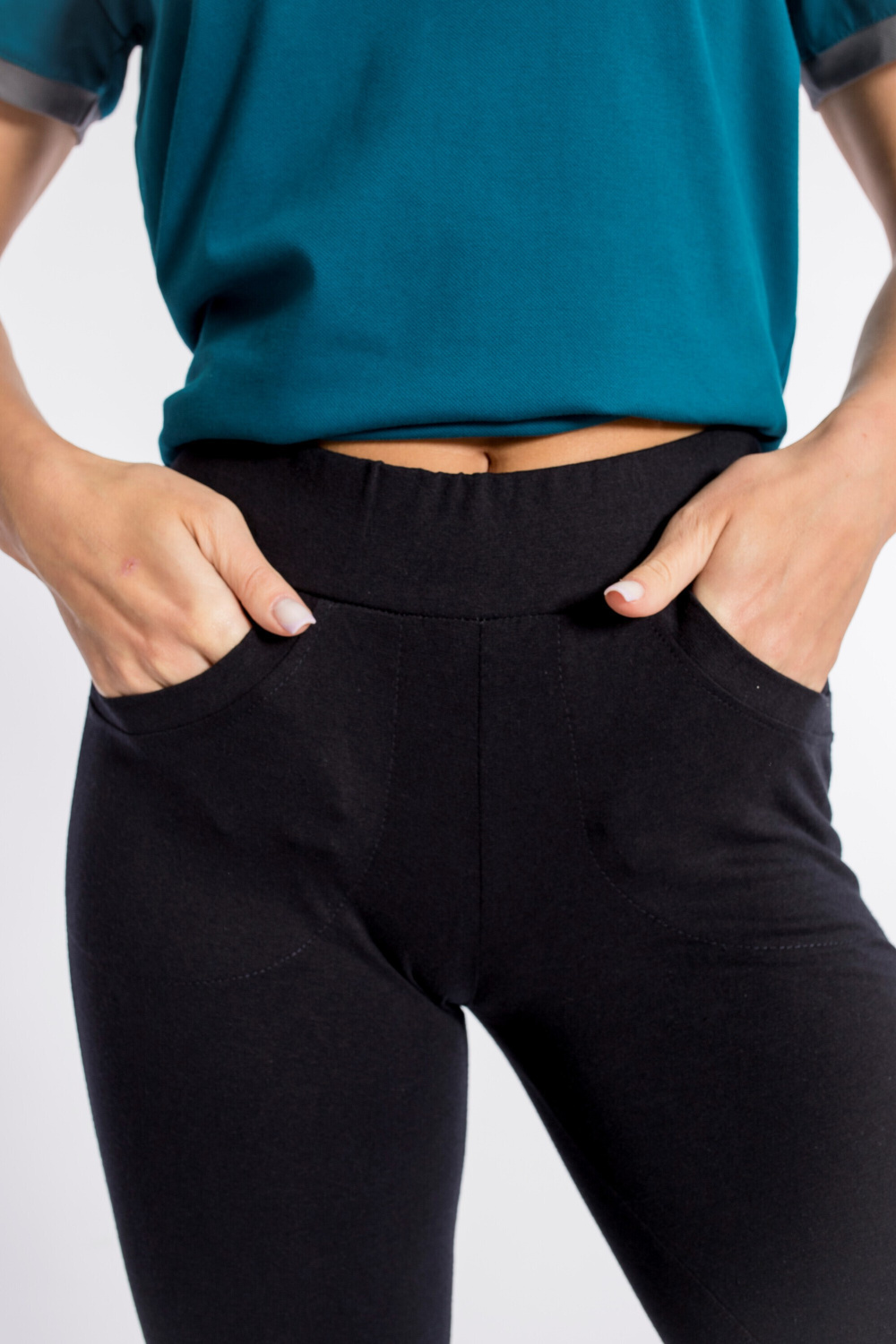 Бриджи женские выполнены из однотонного хлопкового полотна с добавлением лайкры. Силуэт облегающий, низ на манжете. Спереди размещены два кармана, пояс на резинке.