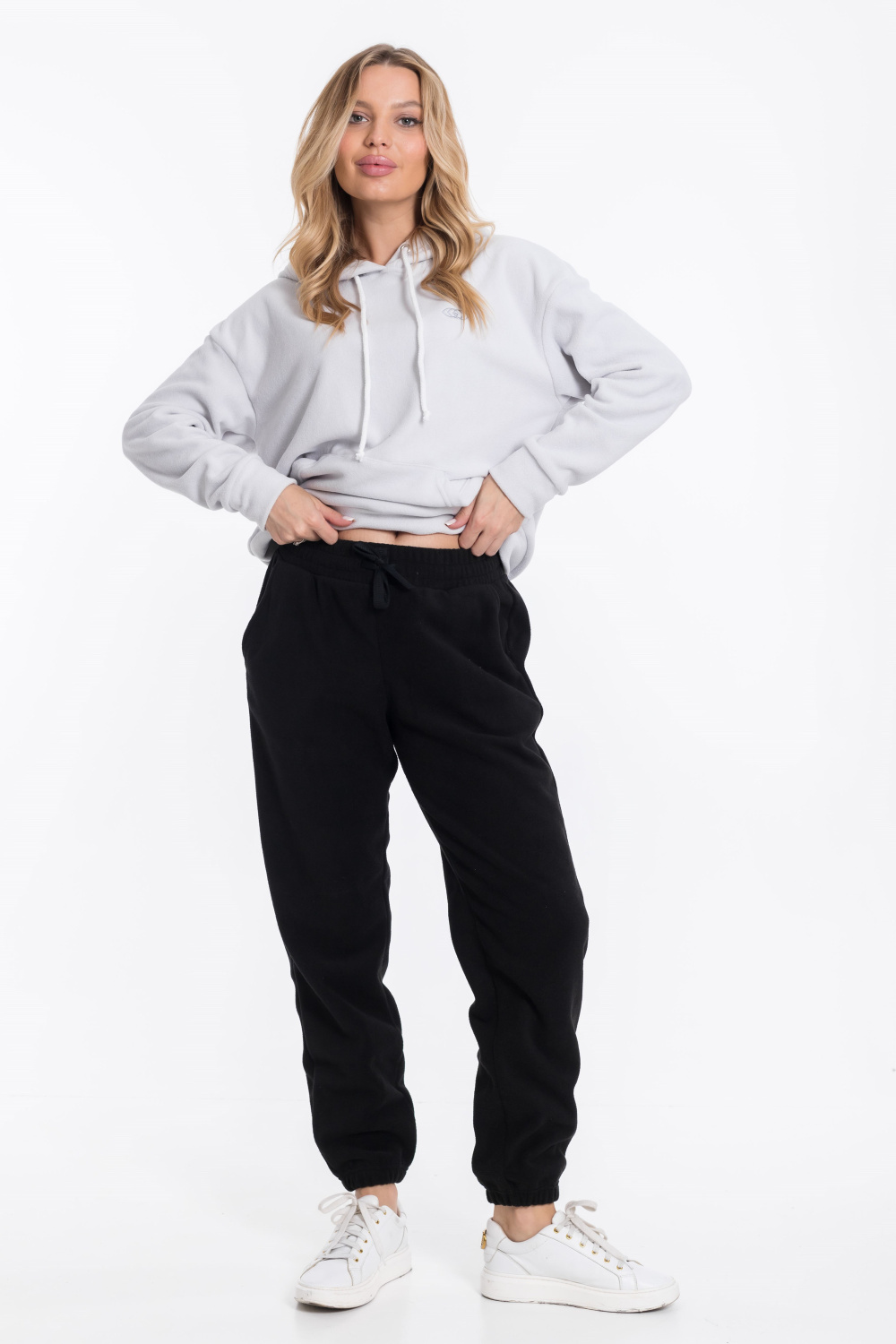 Женские чёрные брюки из флиса — отличный выбор для повседневной носки. Боковые карманы и пояс на резинке со шнуром обеспечивают комфортную посадку, а низ штанин на резинке хорошо садится по фигуре. Брюки сохраняют тепло и подходят для активного отдыха.