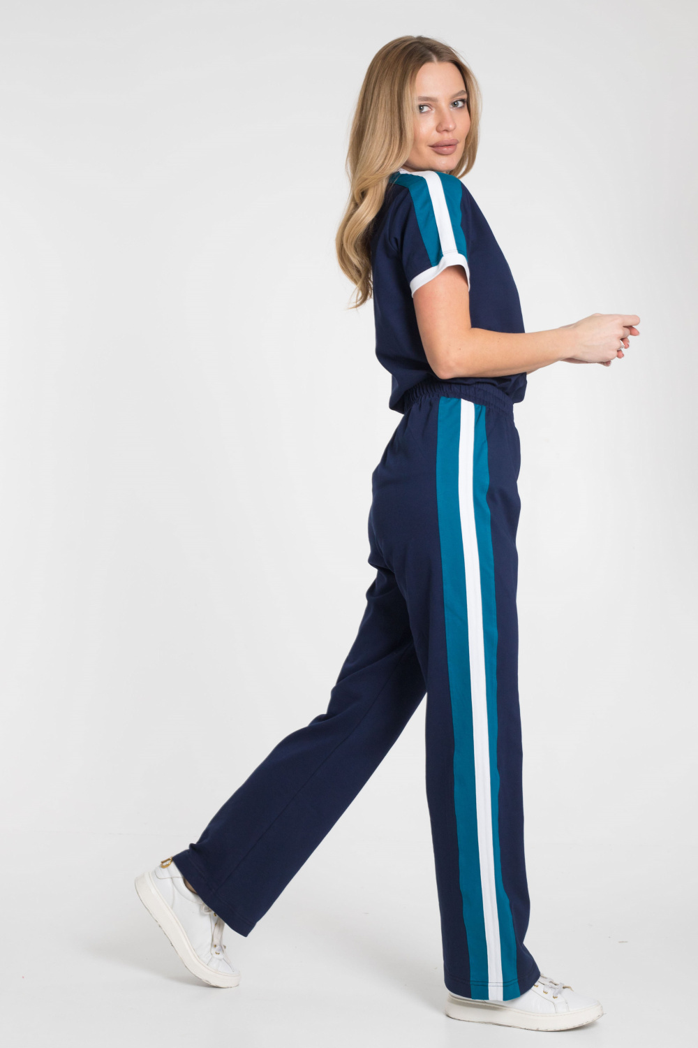 Брюки прямого силуэта с контрастными вставками в боковых швах, пояс на резинке.