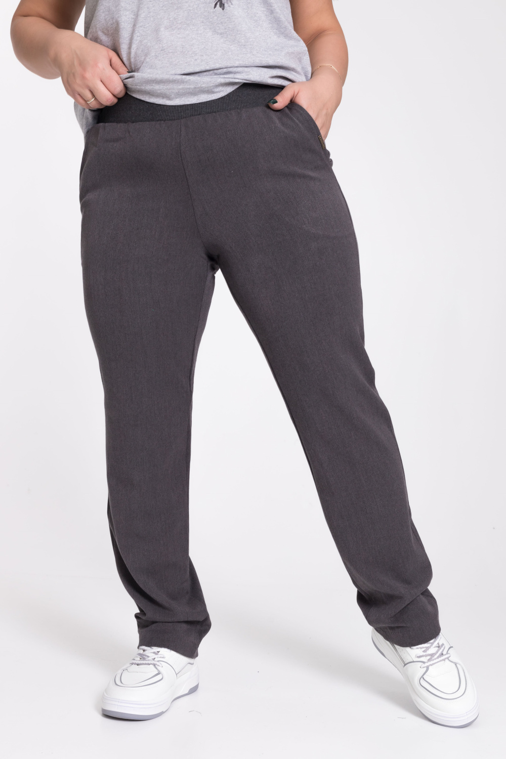 Брюки из костюмного полотна, классической формы. С боковыми карманами и трикотажным поясом на резинке.