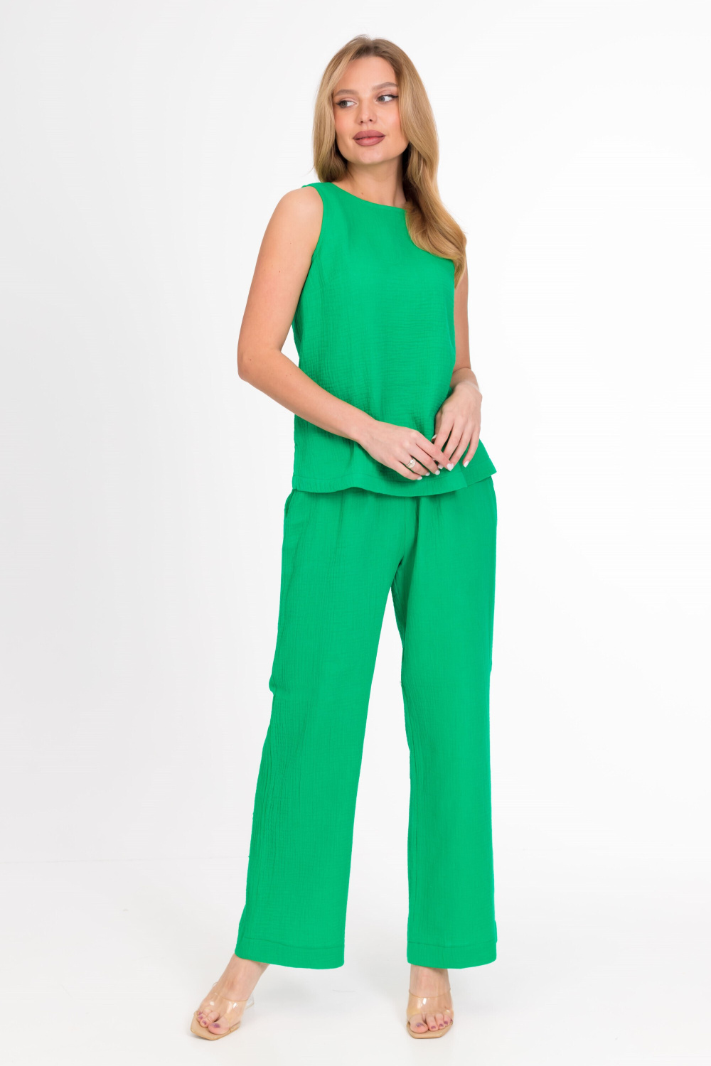 Брюки из однотонного муслина. Свободный крой, боковые карманы, пояс на резинке.