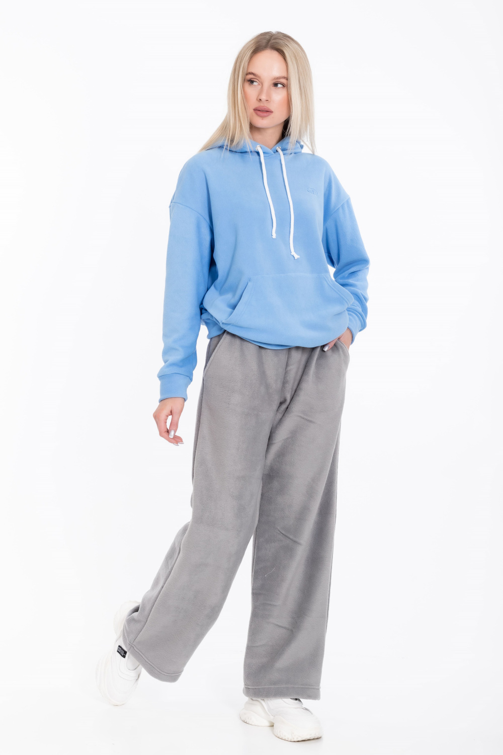 Женские серые брюки свободного кроя из поларофлиса — отличный выбор для повседневной носки. Материал хорошо сохраняет тепло, а пояс на резинке обеспечивает комфортную посадку. Брюки имеют удобные карманы, что делает их практичными.