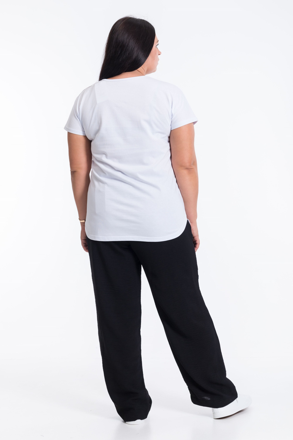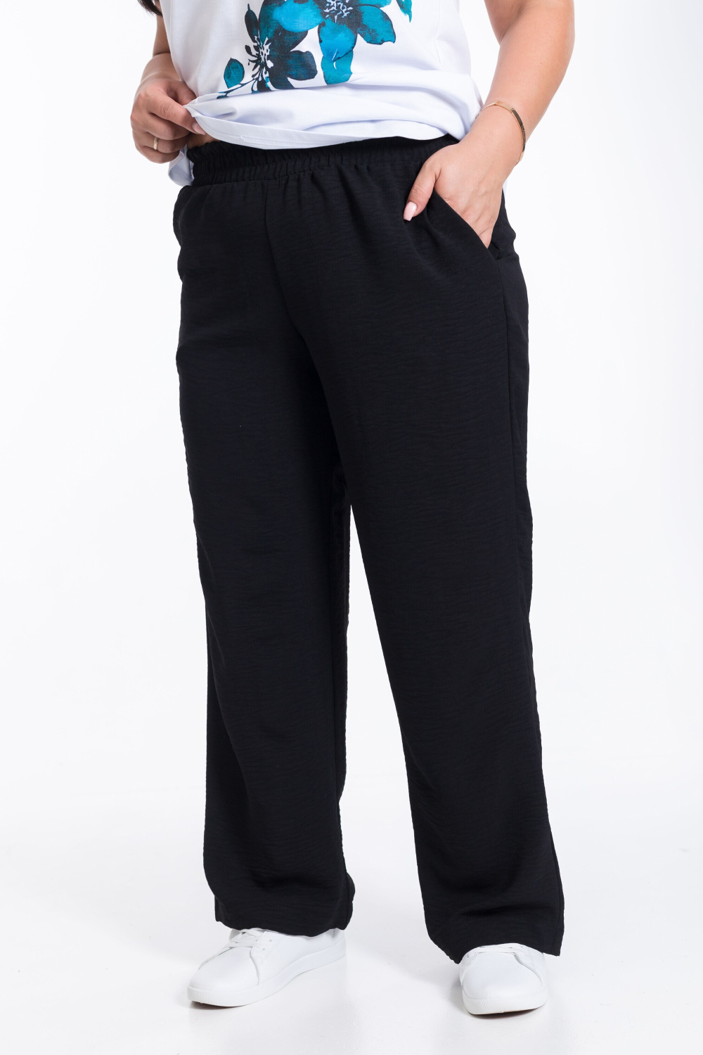 Женские черные брюки свободного силуэта из однотонного полотна манго хорошо садятся по фигуре, а боковые карманы добавляют практичности. Широкий пояс на резинке обеспечивает комфортную посадку.