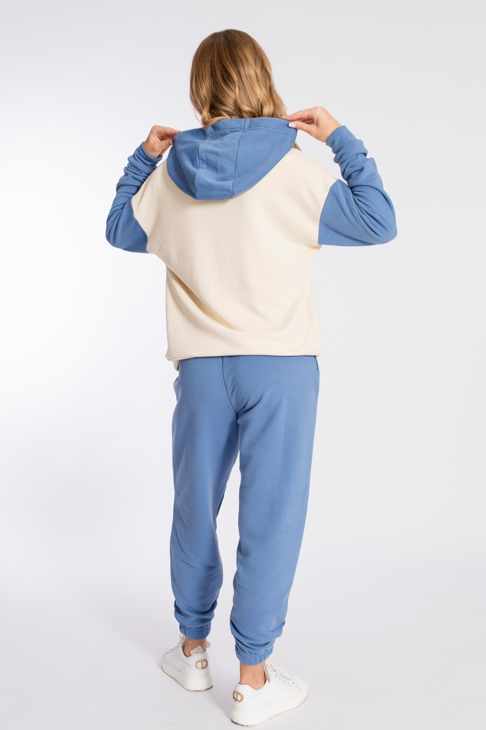 Брюки выполнены из однотонного футера трёхнитки (воздушка), с притачным поясом и резинкой по низу. По бокам размещены карманы.