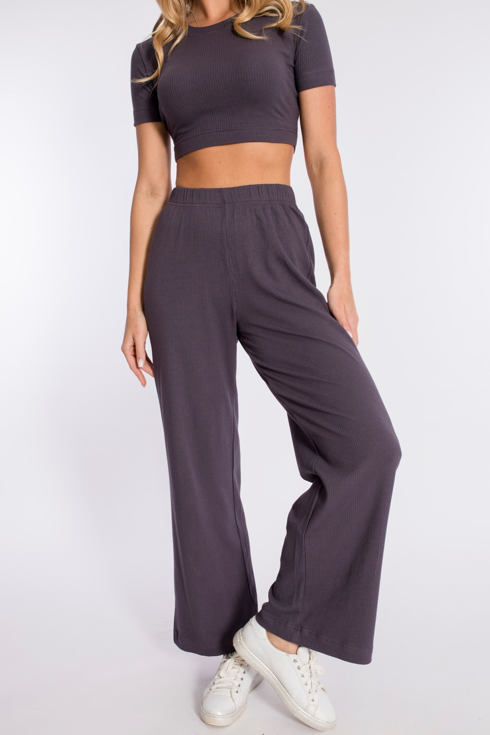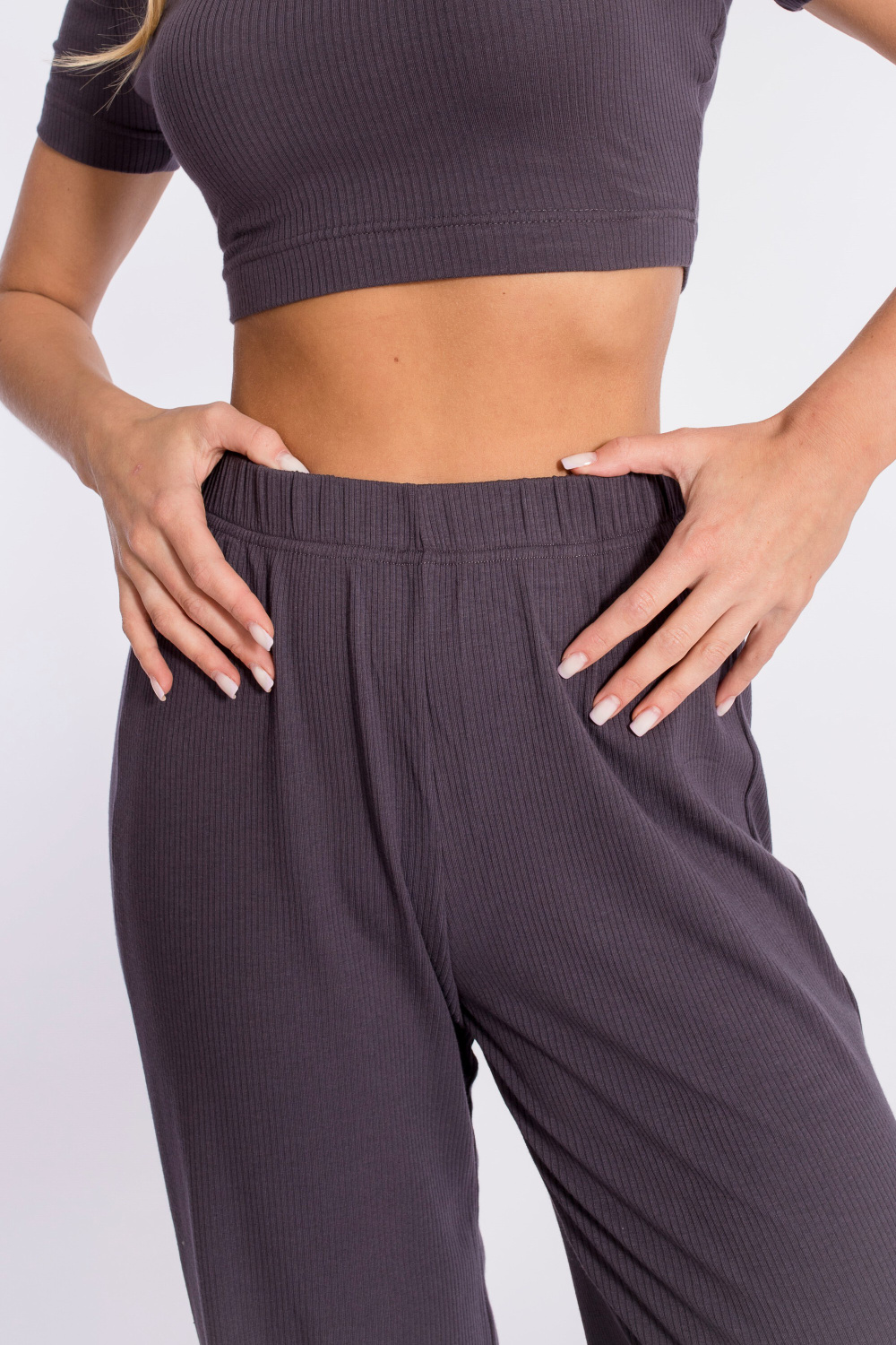 Женские брюки выполнены из однотонной кашкорсе-вискозы. Силуэт свободный, пояс на резинке.