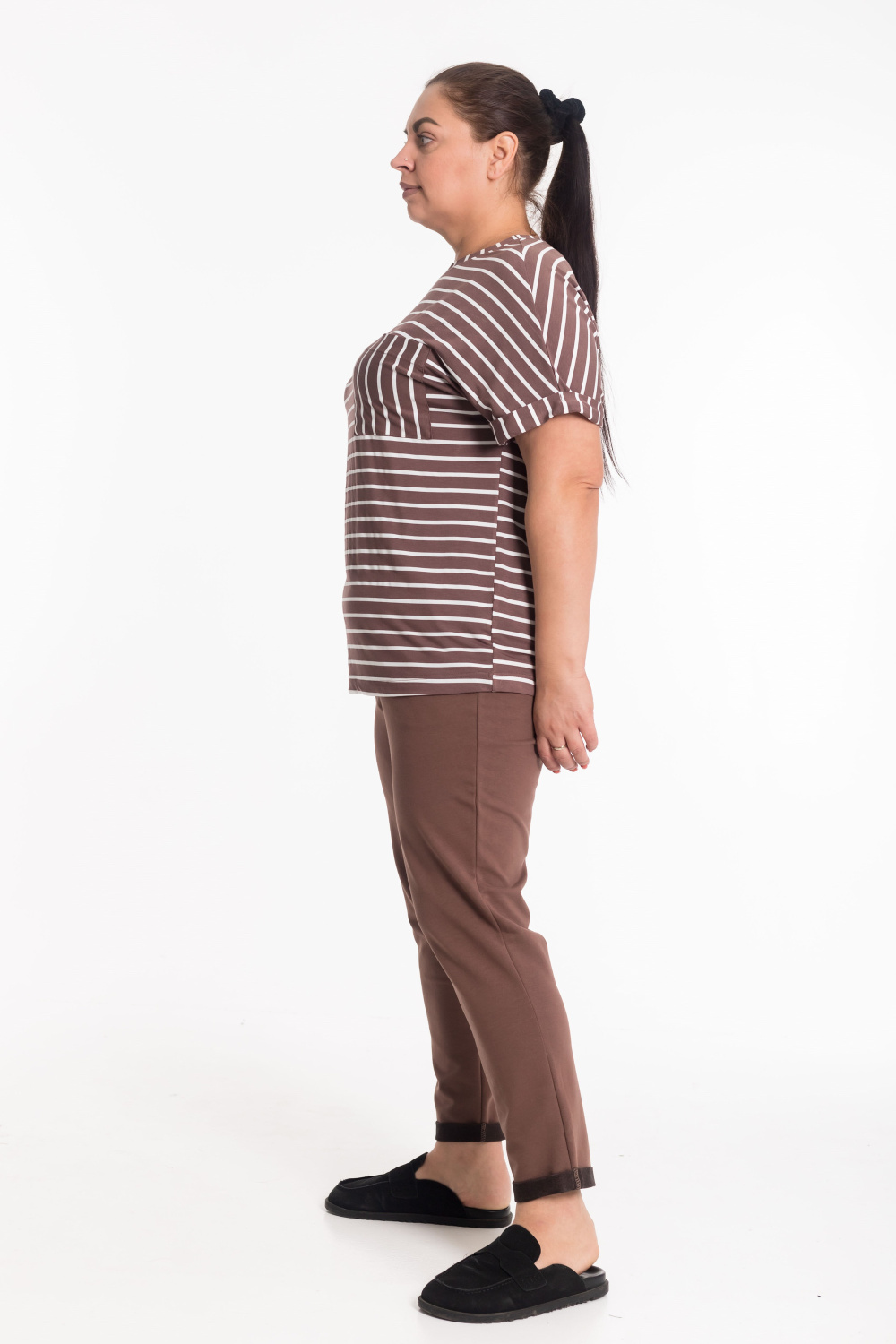 Однотонные коричневые брюки из футера с лайкрой — отличный выбор для повседневной носки. Пояс на резинке обеспечивает удобную посадку, а боковые карманы и отвороты внизу делают модель стильной и практичной. Брюки из футера идеально подойдут для активного отдыха или прогулок.
