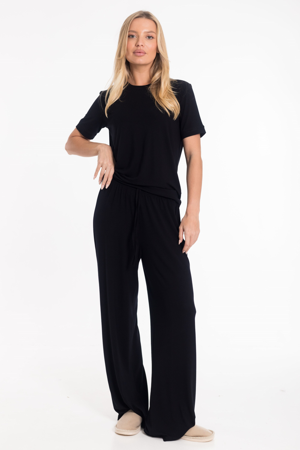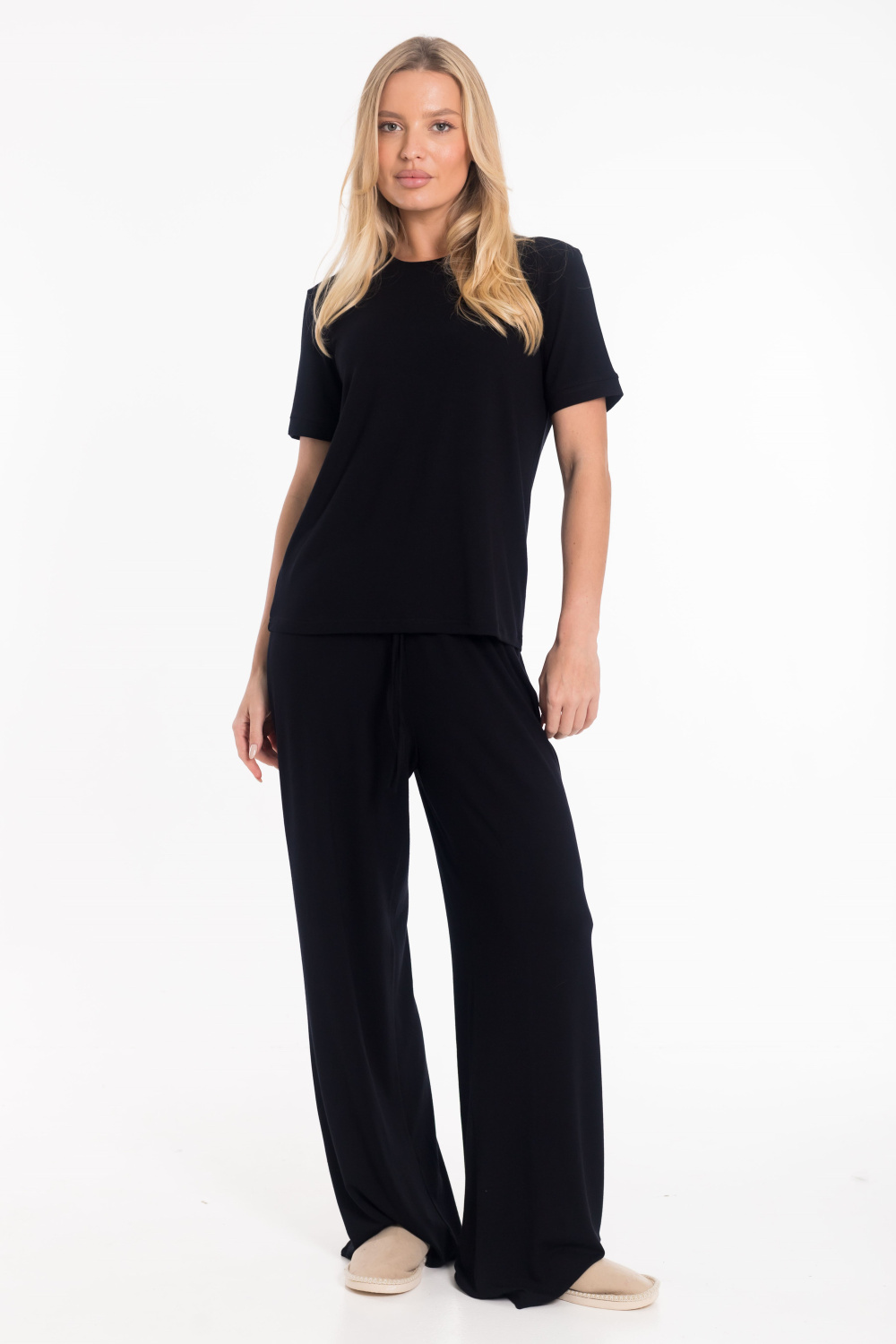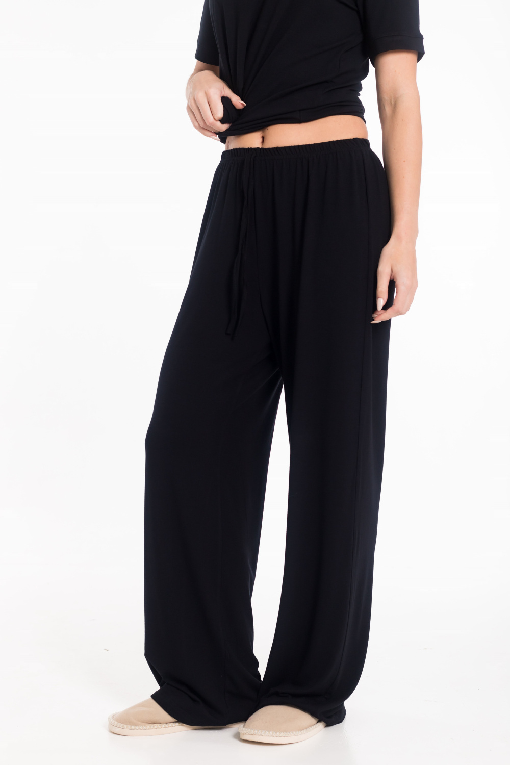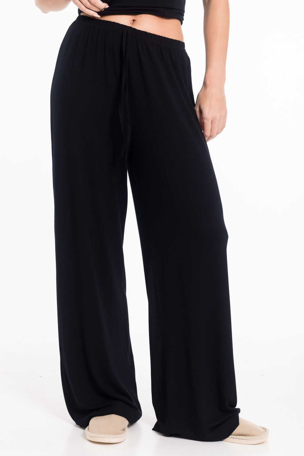 Широкие женские брюки выполнены из чёрной вискозы - гладкого и приятного к телу материала, обеспечивающего комфорт в носке. Модель с поясом на резинке и декоративным шнуром отличается лёгкостью и универсальностью. Брюки без карманов, со средней посадкой, легко комбинируются с различными элементами гардероба.