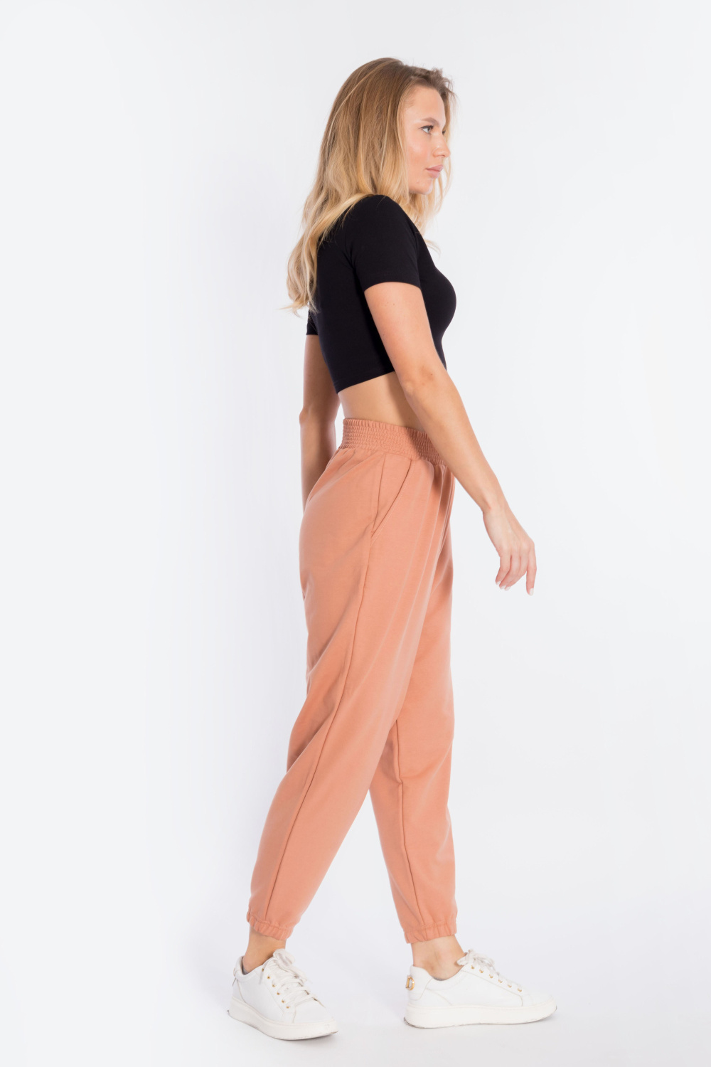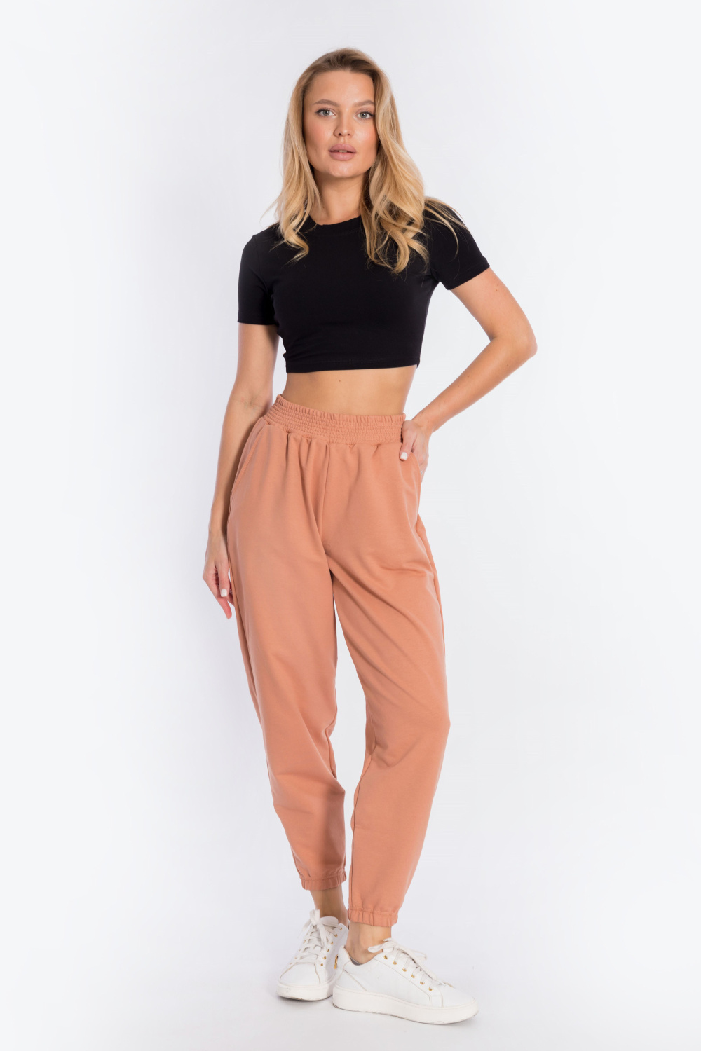 Брюки выполнены из однотонного футера с лайкрой, с притачным поясом и резинкой по низу. По бокам размещены карманы.