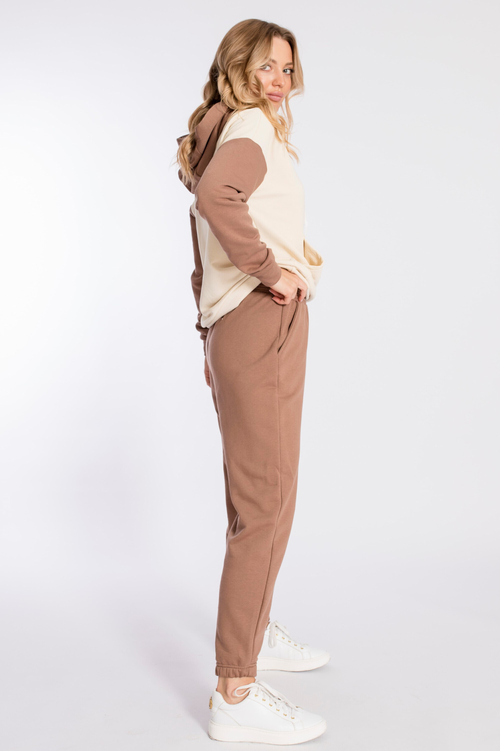 Брюки выполнены из однотонного футера трёхнитки (воздушка), с притачным поясом и резинкой по низу. По бокам размещены карманы.