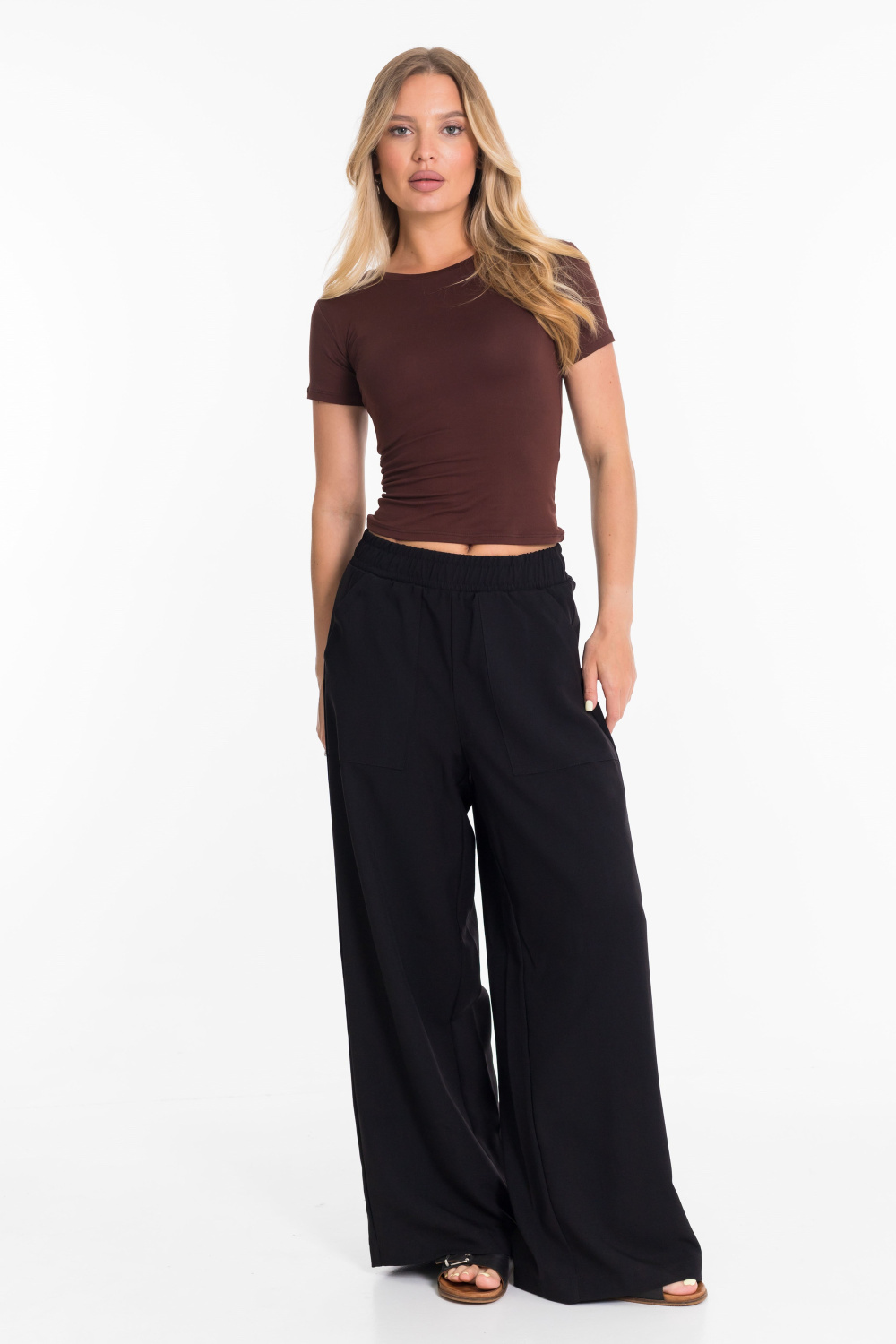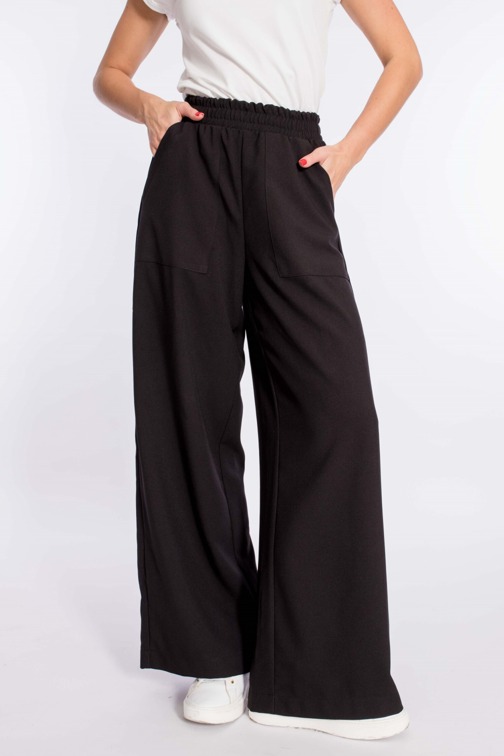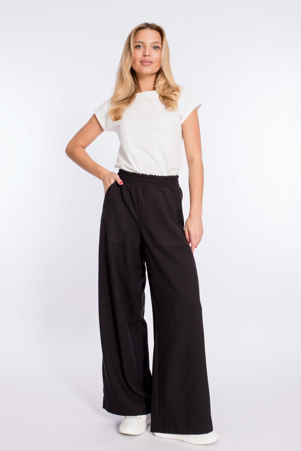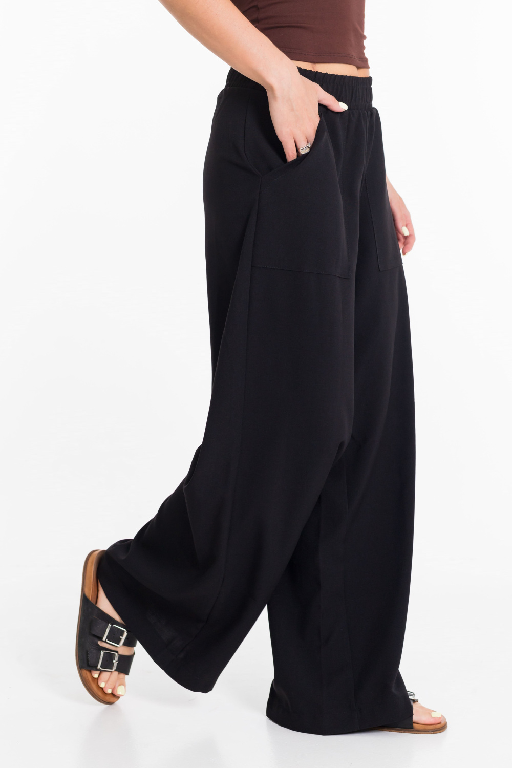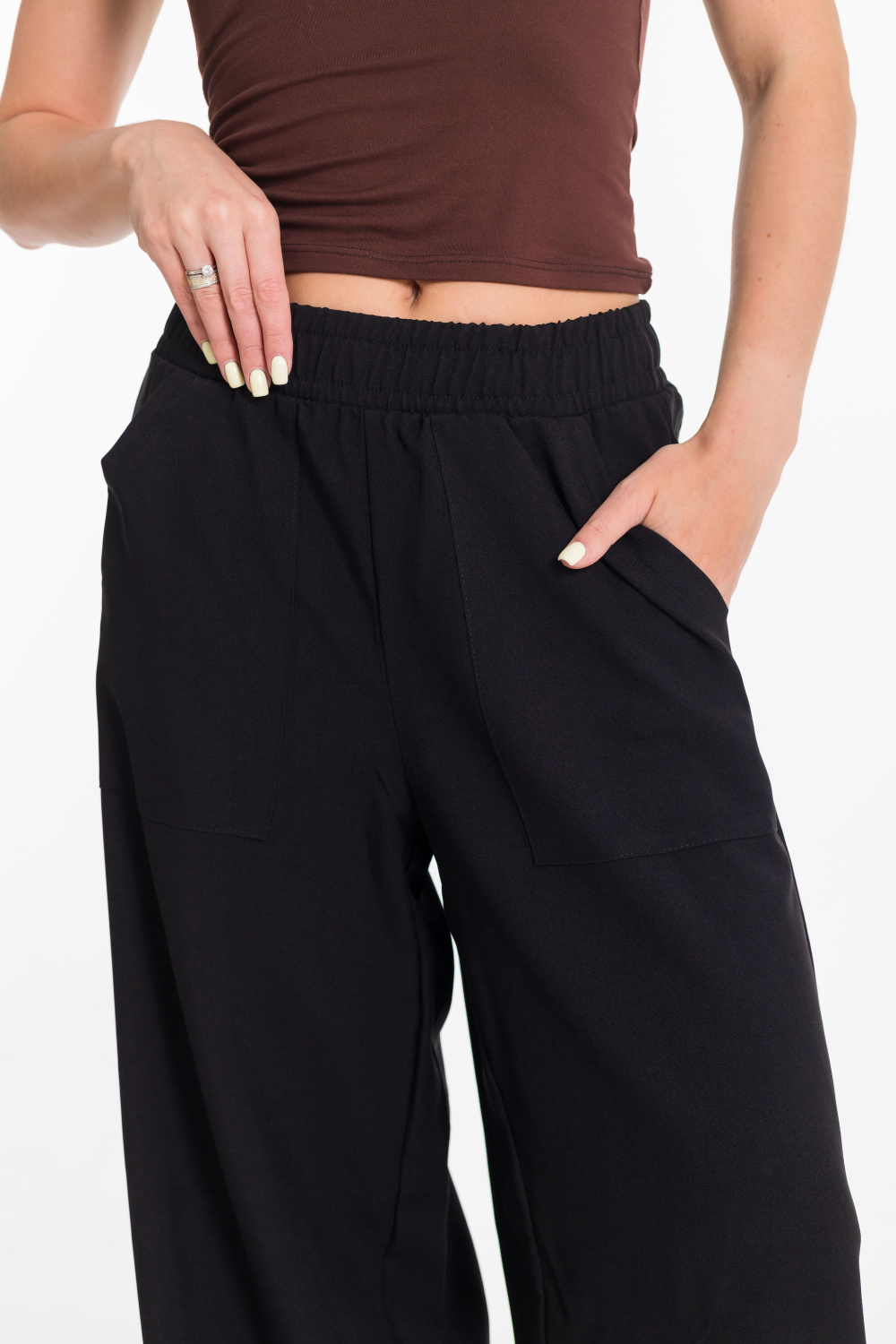 Женские брюки свободного силуэта выполнены из искусственного льна. Спереди настрочены карманы, пояс на резине.
