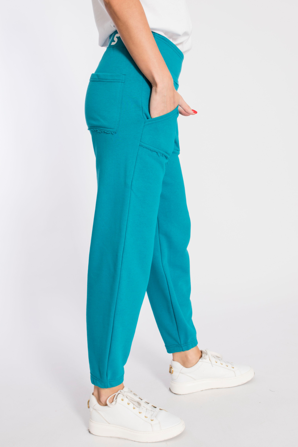 Брюки из однотонного футера воздушки с широким поясом и резинкой по низу брюк. Спереди и сзади размещены накладные карманы с открытыми срезами. На задней части пояса нанесён термопринт.