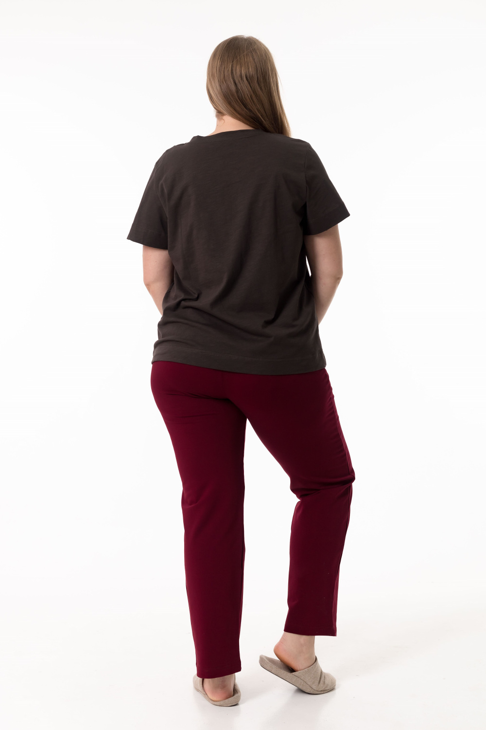 Брюки женские выполнены из однотонной футер петли с лайкрой, спереди расположены два кармана, пояс на резинке.
