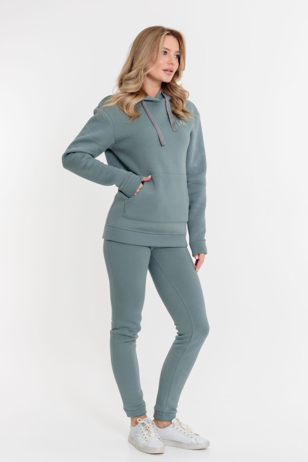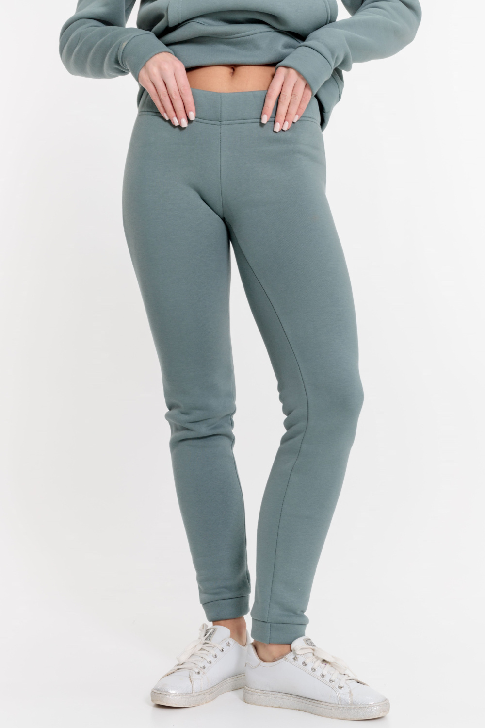 Брюки с поясом на резине и манжетами внизу. Выполнены из полотна с начёсом.